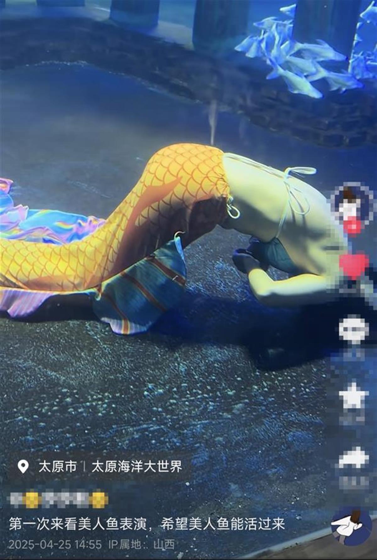 据此前报道,4月26日,上述晕倒“美人鱼”表演者家属表示,目前“美人鱼”意识清醒,有胸闷症状,不过因为呛了水,可能引发肺部感染,仍在重症监护室,需做进一步观察。而涉事的太原海洋大世界已暂停营业,其官方抖音账号已删除了25日晚“美人鱼”醒后发声的视频。
