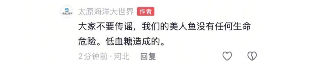 4月25日,山西太原海洋大世界一名美人鱼演员在水下表演时晕倒,令网友揪心不已。太原海洋大世界官方账号留言称,该表演者晕倒系低血糖导致,无生命危险。26日,有业内人士接受记者采访时表示,演员在下水之前,一般进食较少,因为在水中翻滚、旋转等,可能导致腹部不适,影响发挥。