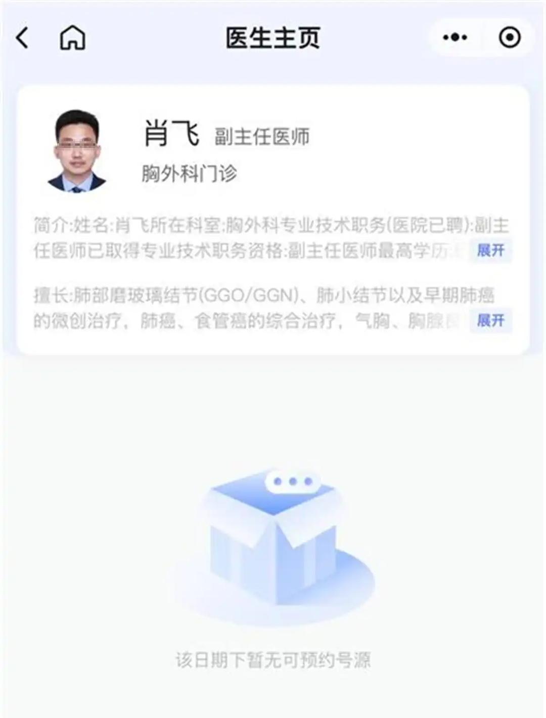 据报道,4月27日晚,该医院发布情况通报称,经核查,举报材料反映的肖某个人问题基本属实。根据相关规定,对肖某予以开除党籍处分,并解除聘用关系。当晚,该医院预约挂号系统显示,其名下已无可预约号源。