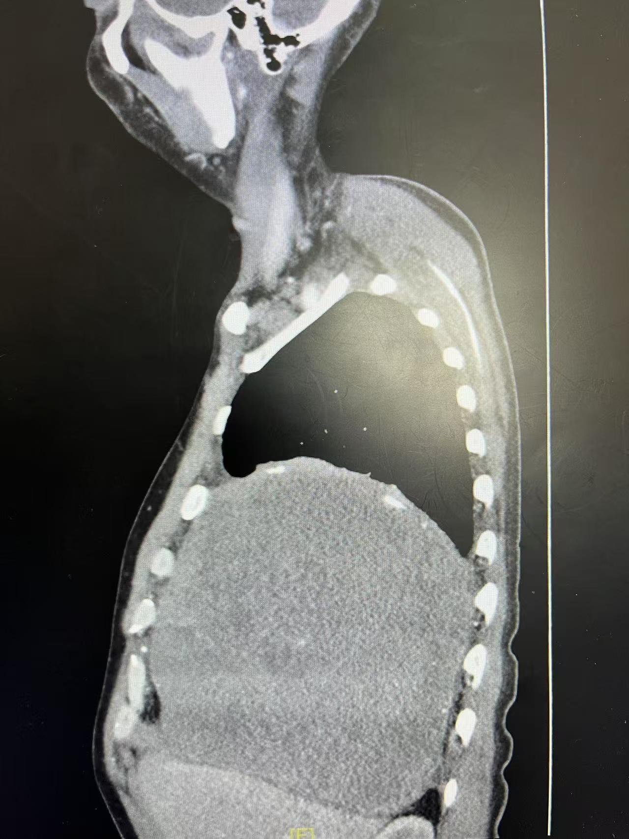 依托粤黔医联体双向转诊机制,陈先生随后通过绿色通道入住珠江医院。检查结果显示,肿瘤最大截面达17.5cm×12.6cm,相当于成年男性头颅大小,与肺、心脏形成致密粘连,而且右肺的上半部分已经被压迫变硬,完全失去了功能。