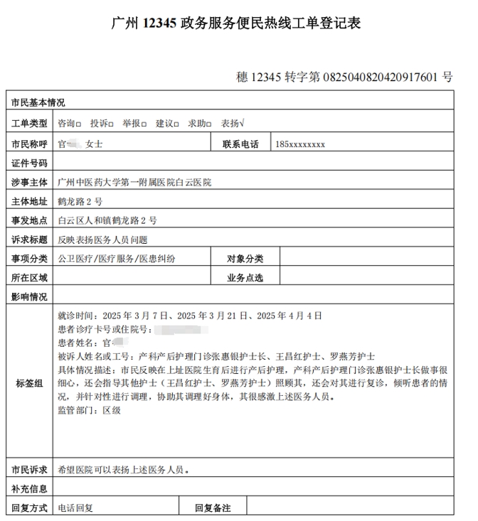 每一通12345热线电话背后,都可能藏着一段不为人知的故事。近日,广州中医药大学第一附属医院白云医院(下称“白云医院”)收到一封来自“12345”的表扬工单。一位曾经被产后综合征深深困扰的二胎妈妈官女士在电话中表达了对该院产后护理团队的由衷称赞与感谢。