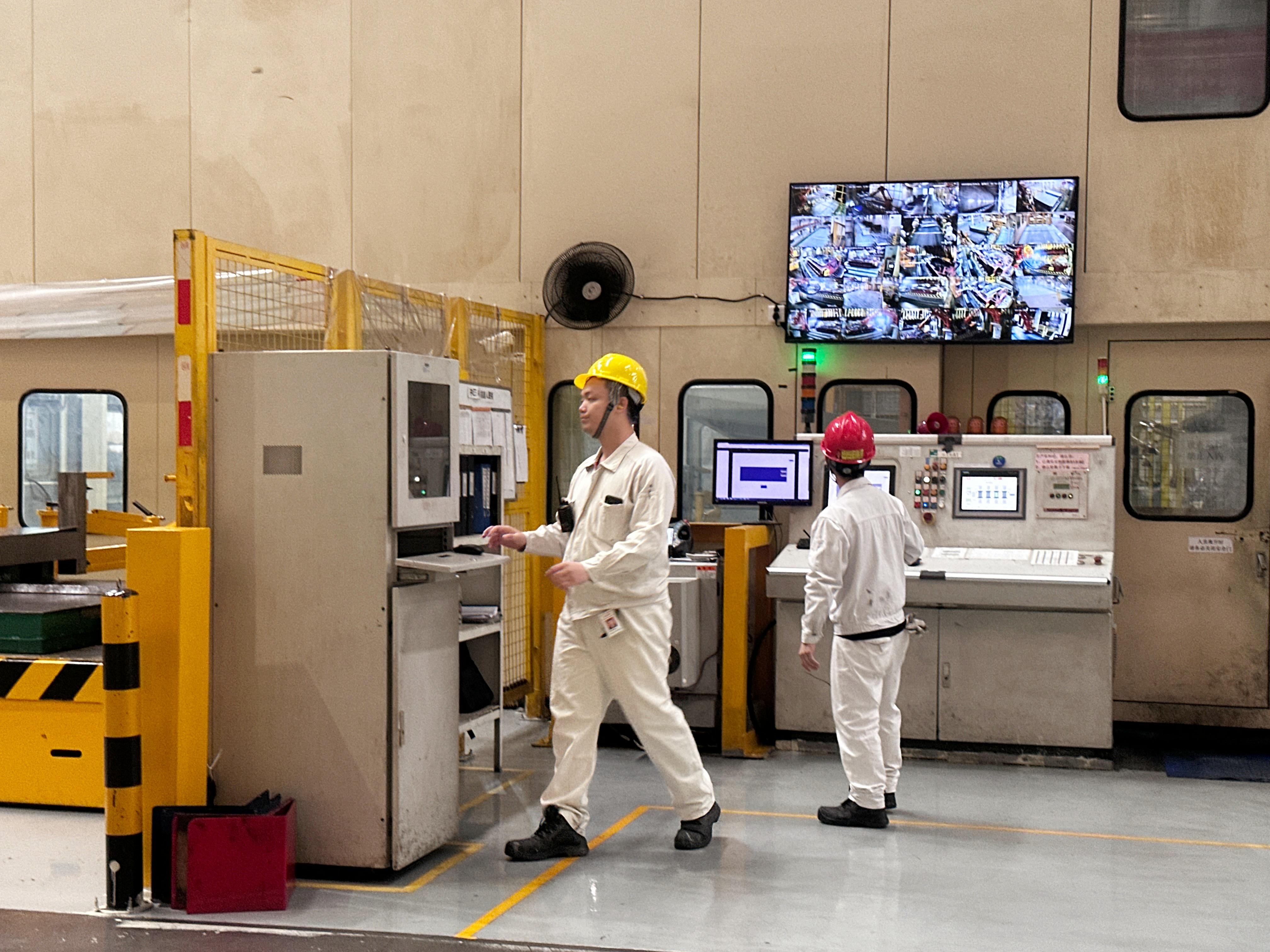 走进冲压车间,一块块钢板被冲压成汽车前盖、后盖等,噪声巨大。冲压车间员工周长敬表示,长时间在这里工作,肯定受不了,所以车间基本上都是机器自动化操作,车间除了设置封闭隔声罩控制压力机噪声外,对出件口的位置(存在噪声外溢),采用延长输送线与建造隔音房的方式,将员工作业岗位噪声降至85分贝以下。