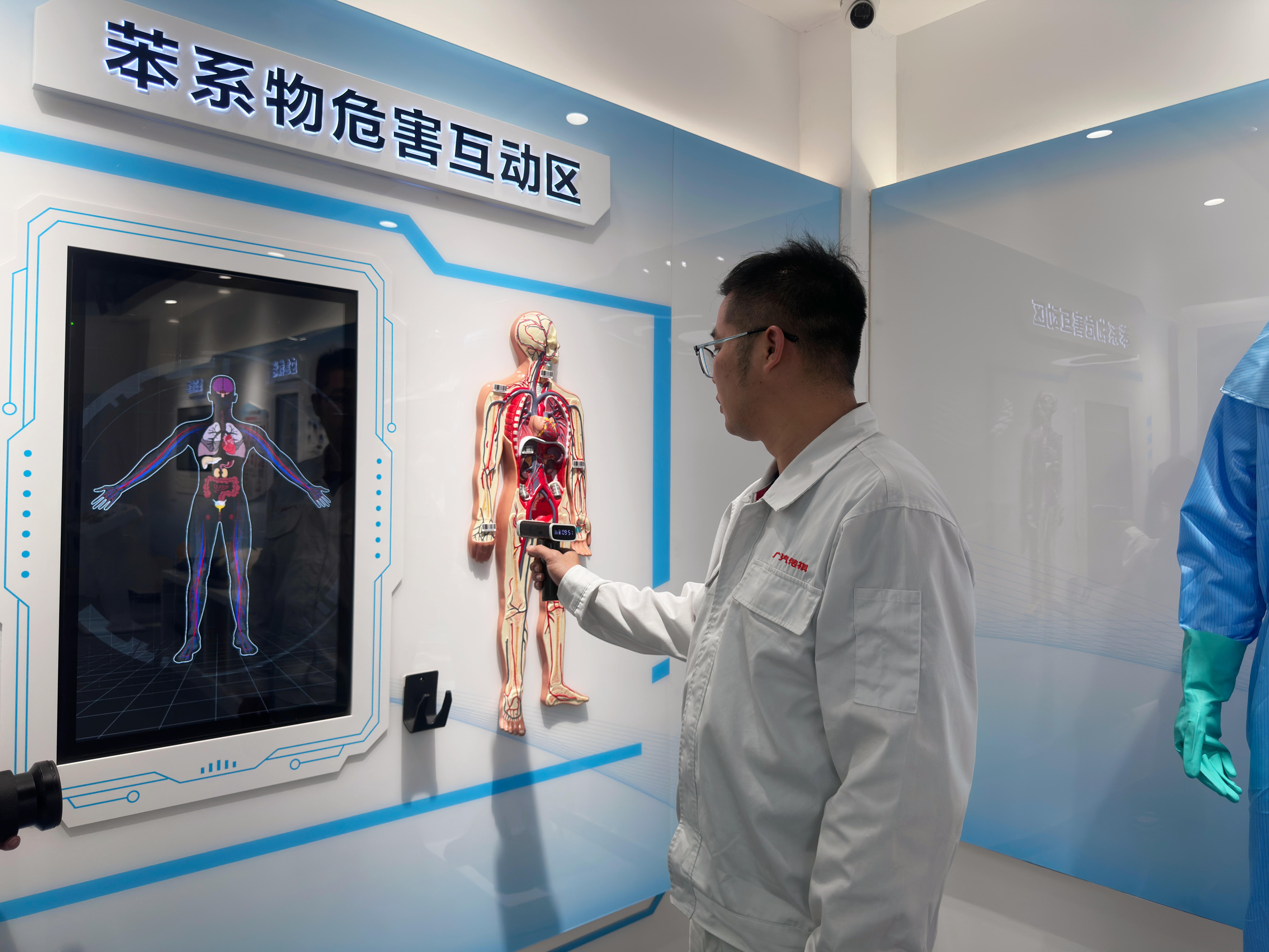 在苯系物危害展示区,广汽传祺员工骆润良手拿扫描枪在人体模型上扫描一下,红色轨迹清晰地显示着有毒气体在器官间的流动路径。“以前觉得喷房(喷漆室)气味刺鼻,现在才知道这些‘红蛇’会慢慢啃噬健康。”员工骆润良的比喻,道出了可视化教育的穿透力。