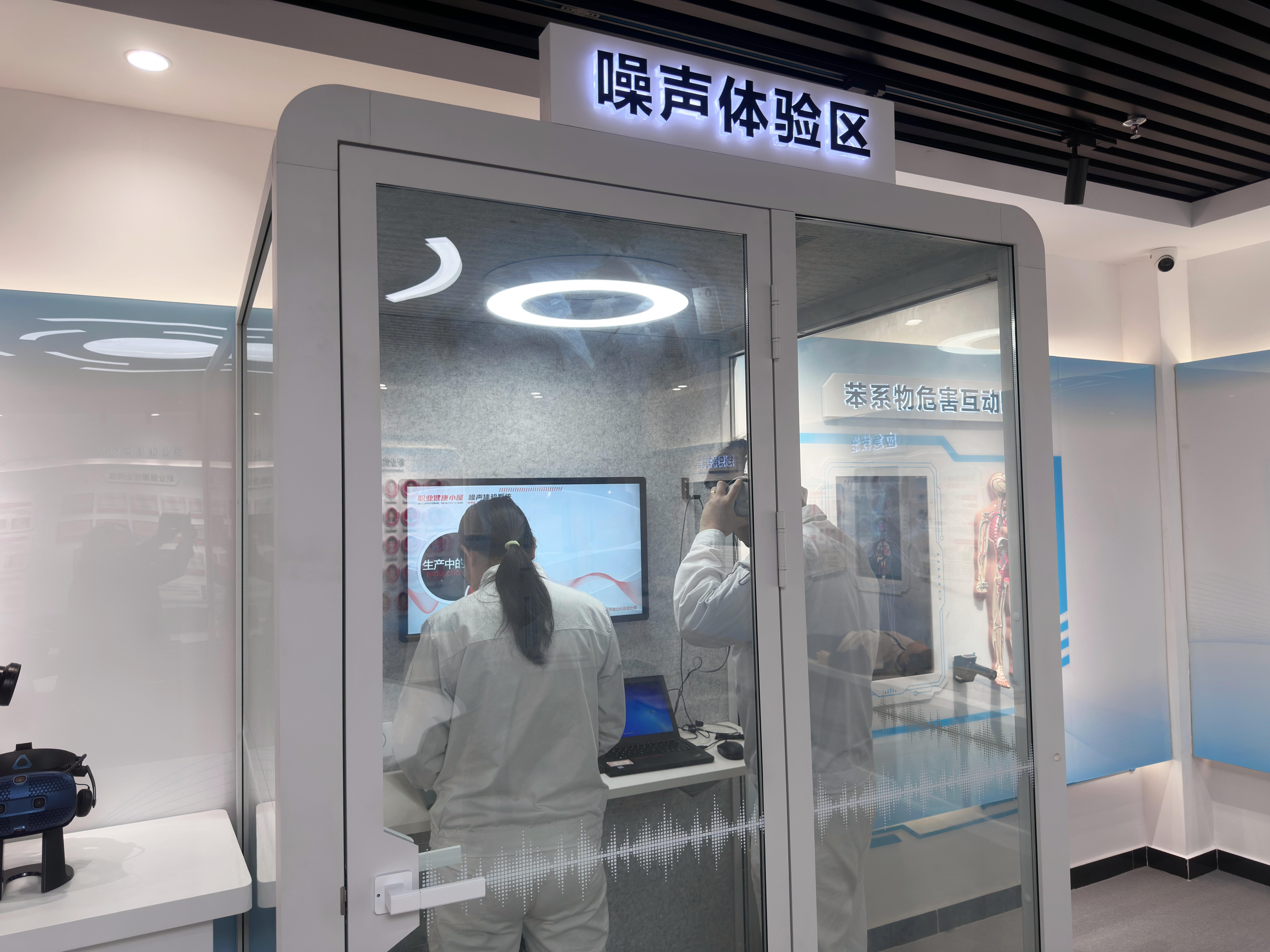 在小屋,这里有职业健康科普知识、体验互动、劳保穿戴、应急救治以及知识竞答等多种方式。最令人印象深刻的莫过于VR体验区和噪声体验区。“点击这个按钮,我就能听到总装车间空压机房内特有的金属碰撞声。”看到仪表上的数值飙升至90.8分贝,头戴耳机的陈经纬下意识皱鼻子:“平时上班,并没有留意到噪声的危害,常常不重视戴耳塞。”他坦言健康小屋的噪声体验“比领导训话管用”。