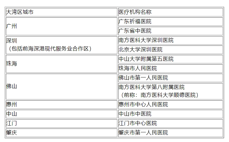 根据此次公布的新增医疗机构名单,广州、深圳、珠海、佛山各有两家,惠州、中山、江门、肇庆各一家。其中广州新增医疗机构为广东祈福医院、广东省中医院。