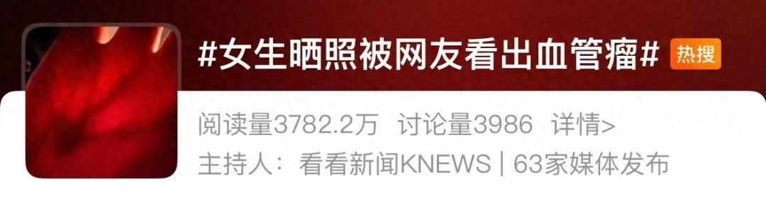 近日,话题#女生晒照被网友看出血管瘤#冲上热搜。