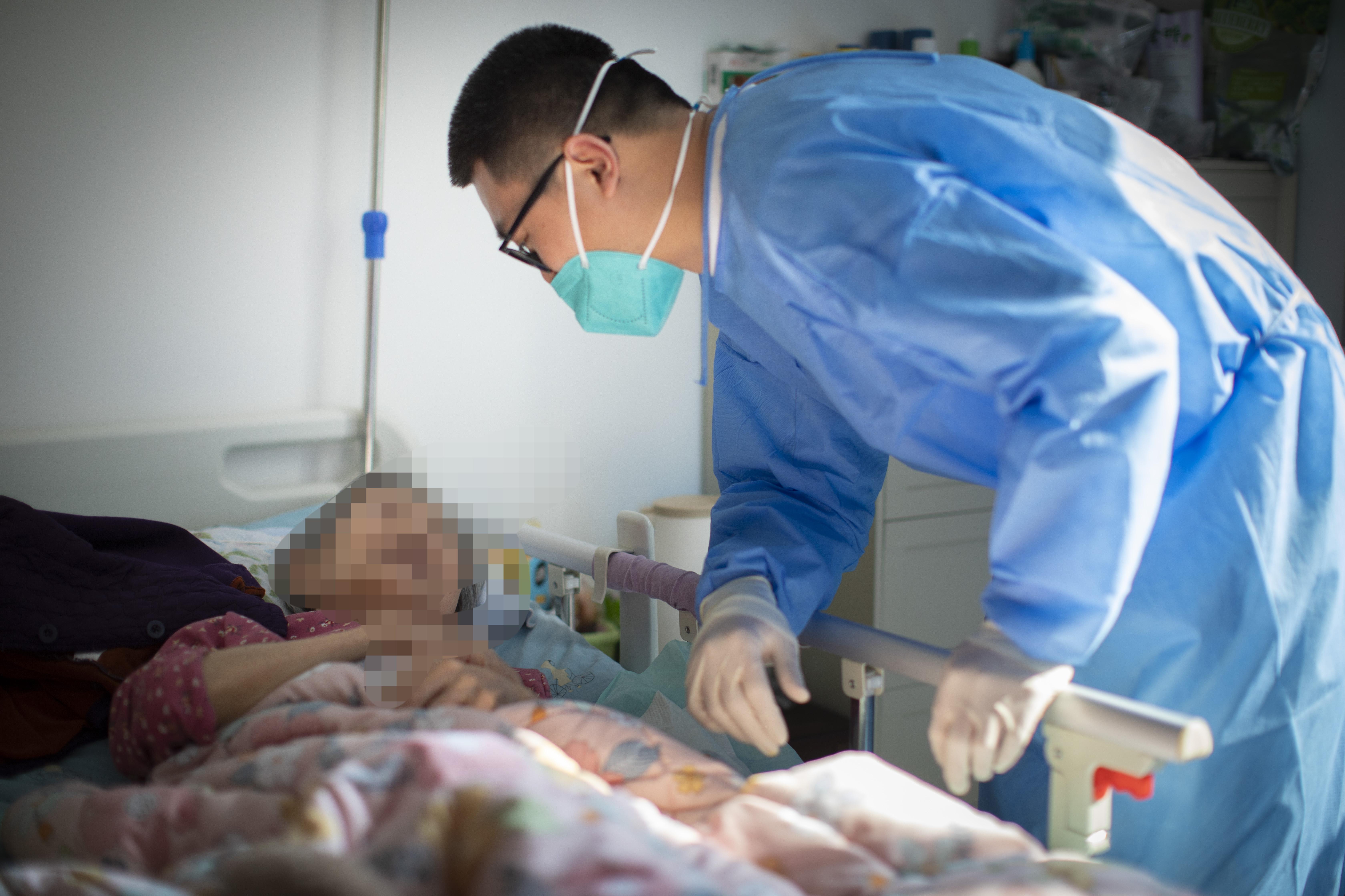 遇到老人紧锁眉头、痛得闷哼或挥手拍打,郎至尊习惯性地弯腰90度、俯身凑近躺在床上的老人,顺手给他们掖一掖被子、整理下领口的衣服,一边摩挲着他们粗糙松弛的手背,一边提高音量鼓励着:“真棒,真坚强”,安抚他们的紧张情绪。