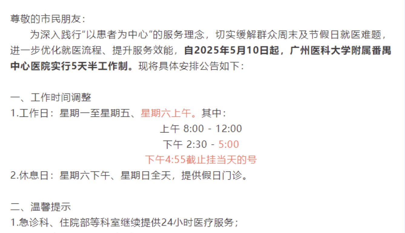 为破解市民周末就医难题,广州番禺区三所三甲医院持续优化诊疗服务。2024年5月7日,广州医科大学附属番禺中心医院发布公告,明确自2025年5月10日起正式实施“5天半工作制”。此前,广州市番禺区中医院、广州市番禺区何贤纪念医院已率先开展周六上午的全面门诊服务。