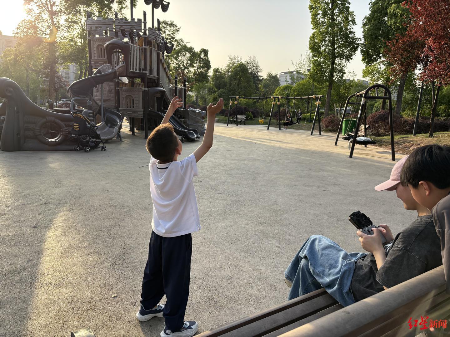 4月17日,林静回到大河坝公园出摊,淼淼就在附近玩耍。他和其他孩子一起荡秋千,身体向天空发力,荡得越来越高。有人飞起了无人机,淼淼仰着头,冲天空招手,笑着。