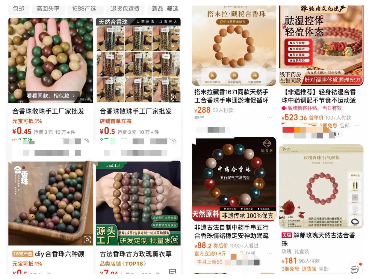 在不同购物平台上,珠串的价格也区别很大。在某购物平台上,合香珠价格在几十元到几百元不等,但在某线上批发平台,其批发价格依据每颗珠子大小不同,价格在0.5元到3.5元不等一颗。记者询问其中一家批发商家是否为纯中药材制成,以及为何如此便宜,商家回复称:“是纯中药,手工加机器。”