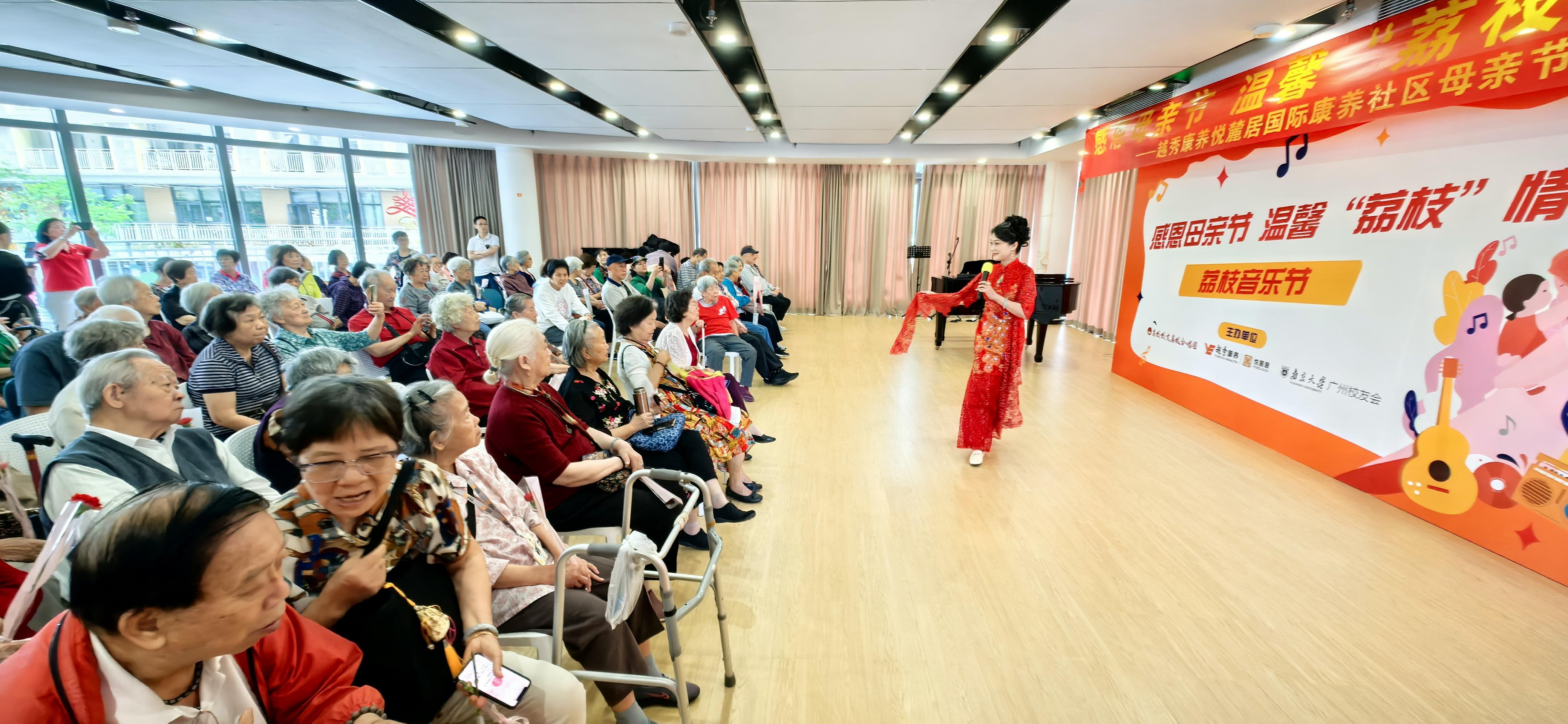 5月11日,高校校友荔枝合唱团携手南京大学广东校友志愿服务队,走进位于广州市白云区的越秀康养·悦麓居康养社区,为居住在这里的百余位长者献上了一场主题为“感恩母亲节 温馨‘荔枝’情”的公益演出。