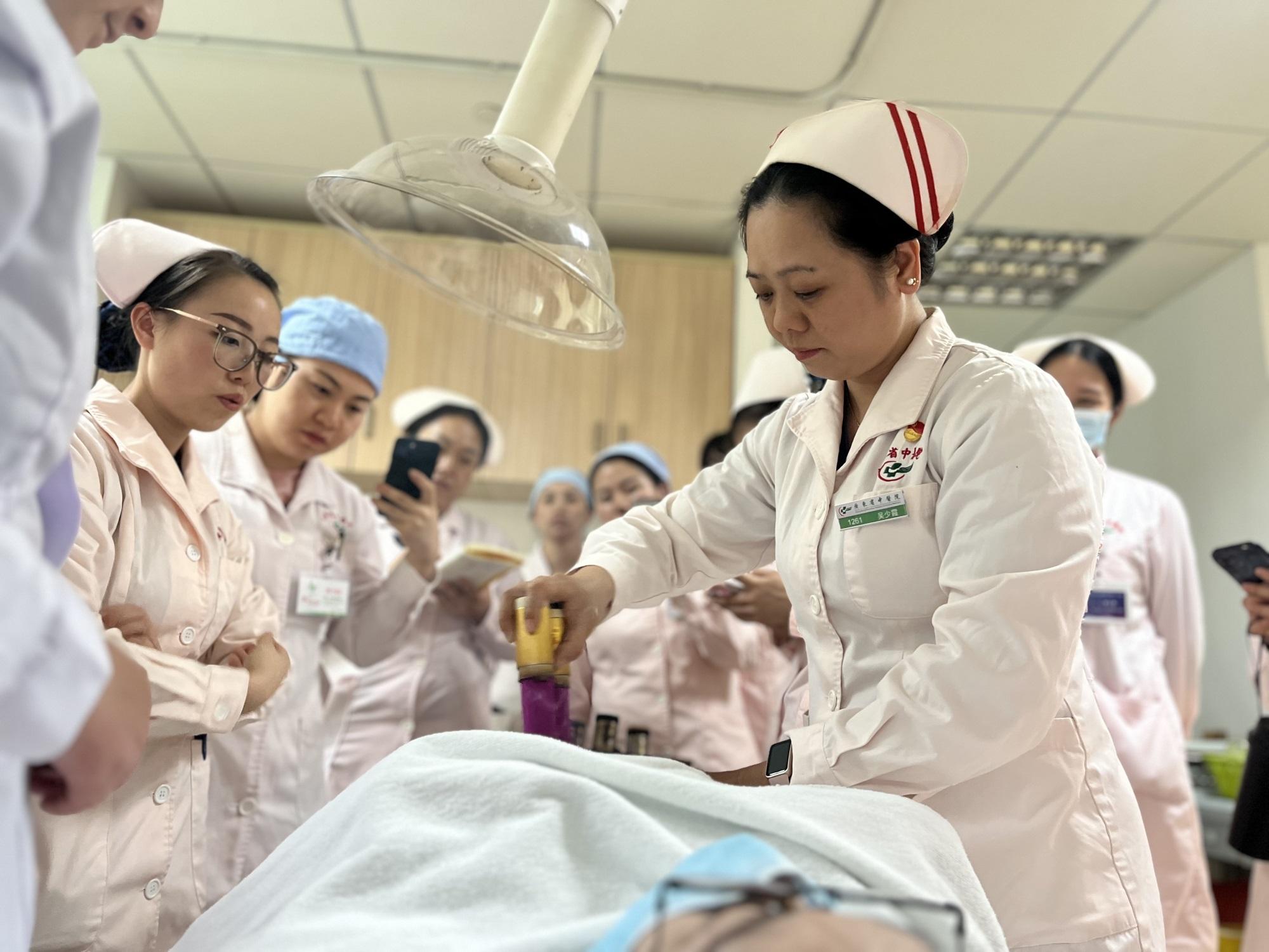 5月10日,护士节前的周末,吴少霞、叶红正在宁夏中医医院参加粤宁协作“杏林沃土”“杏林拔尖人才培养项目”,开设中医护理工作室,为当地中西医结合医疗人才进行培训。“希望有更多中医护理专才成长起来,让中医特色护理门诊惠及更多需要的人。”吴少霞说。
