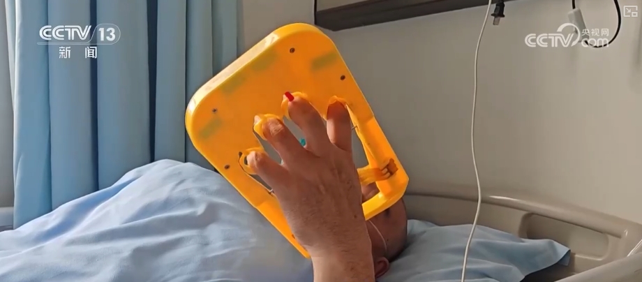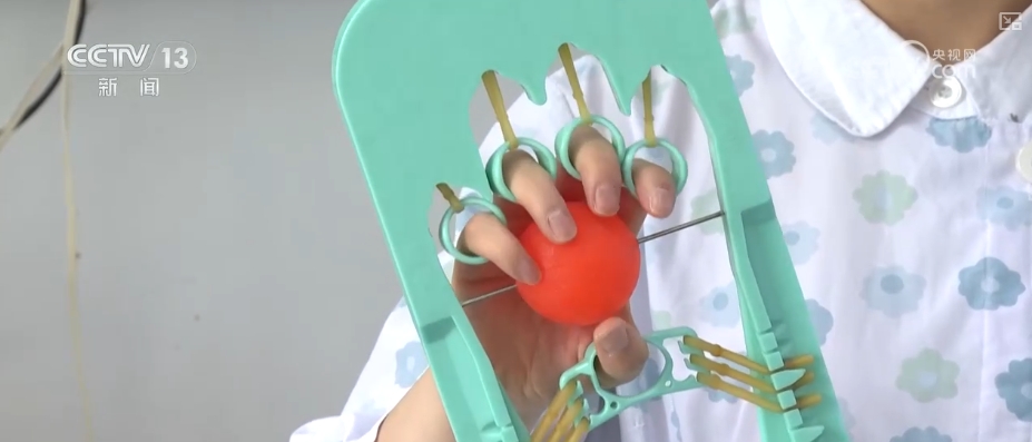 首都医科大学宣武医院骨科护士长李俊介绍,这个指环通过弹力带相连,弹力带底下可以进行调节。比如根据病人手部大小,或手部力量大小进行这个卡扣的调节,固定好握力球就不容易滑落。训练时,病人每做一次就完成一个抗阻运动,使掌指功能、握力肌力都有所提升,也能增进病人血液循环。