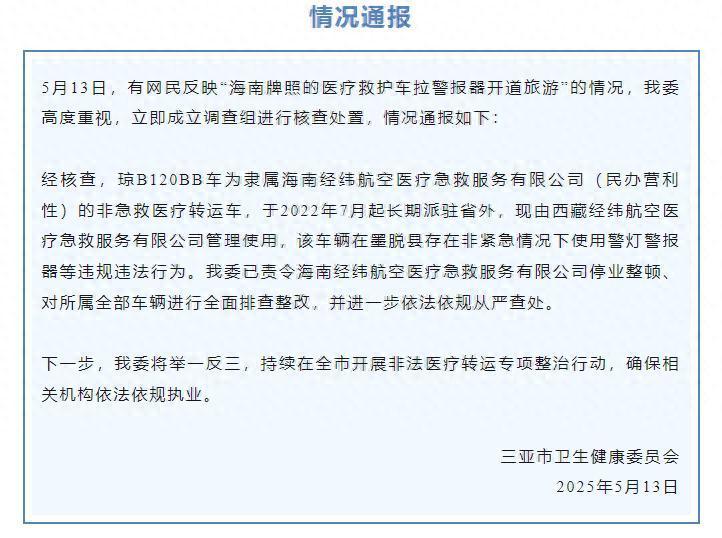 5月13日,有网民反映“海南牌照的医疗救护车拉警报器开道旅游”的情况,我委高度重视,立即成立调查组进行核查处置,情况通报如下: