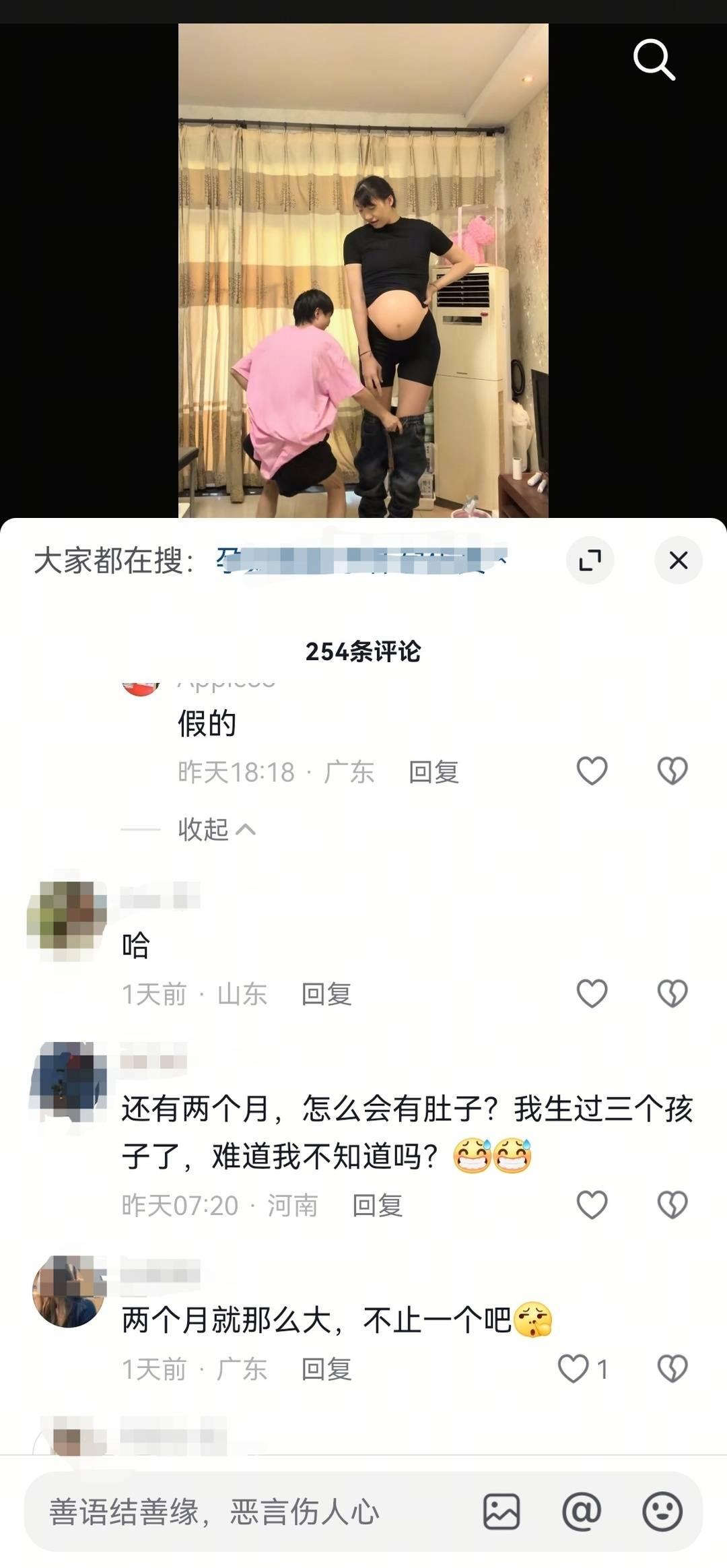 5月11日,两人再更新了一条变身视频。视频中,康女士露出圆鼓鼓的孕肚。不过,一些网友发出了质疑,“肚子这么大”“看着像假肚子”。
