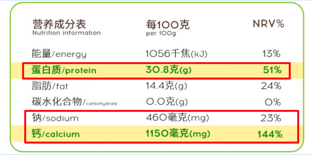 比如以下两款原制奶酪产品,前者蛋白质、钙、钠的NRV%分别为32%、50%、28%;后者分别为51%、144%、23%。这意味着,同样吃100克,前者可提供每日蛋白质推荐摄入量的1/3,后者可提供1/2;前者可提供每日钙推荐摄入量的1/2,后者可提供约1.5天的推荐钙摄入量。同时,后者钠含量稍低于前者。由此可见,单位重量下,后一种奶酪营养更好。