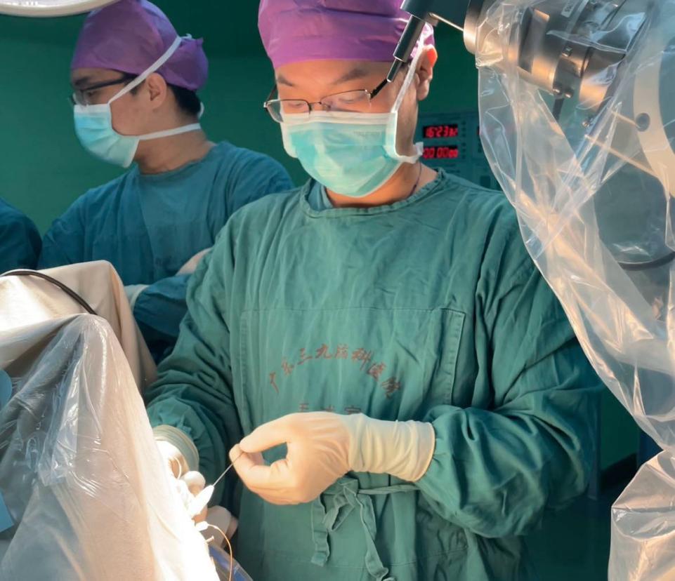 在手术机器人辅助下,陈俊喜带领团队为患儿进行了立体定向脑电图(SEEG)微创置入手术,将6根电极精准置入患儿颅内瘤体,确定放电核心位点后进行微创热凝毁损治疗,解决患儿癫痫发作的情况。