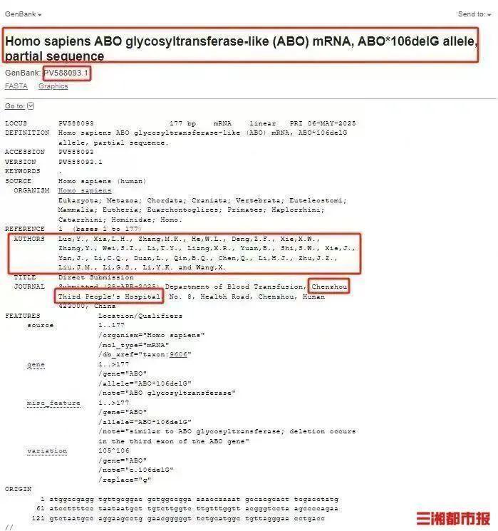 该发现已经通过美国国家生物技术信息中心(NCBI)专家的严格审核,成功收录至其数据库“GenBank”中,新突变序列号为PV588093。最终,这一全新B等位基因型血型得以由国际输血协会公布并正式命名。