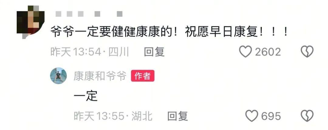 网友纷纷留言:“爷爷一定要健健康康的!祝愿早日康复!”康爷爷回复:“一定。”