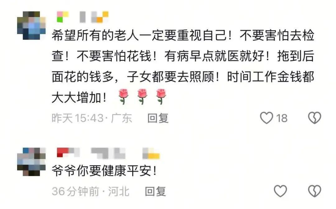 也有网友在评论区呼吁老人们重视自己的身体,不要害怕去检查。