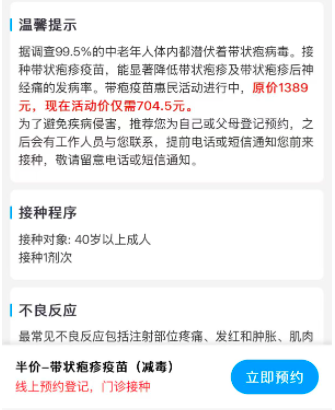 由百克生物生产的国产带状疱疹减毒活疫苗,适用于40岁及以上人群,只需接种一剂,原价为1389元。目前,也有地区接种点推出半价活动,加上接种服务费只需704.5元。