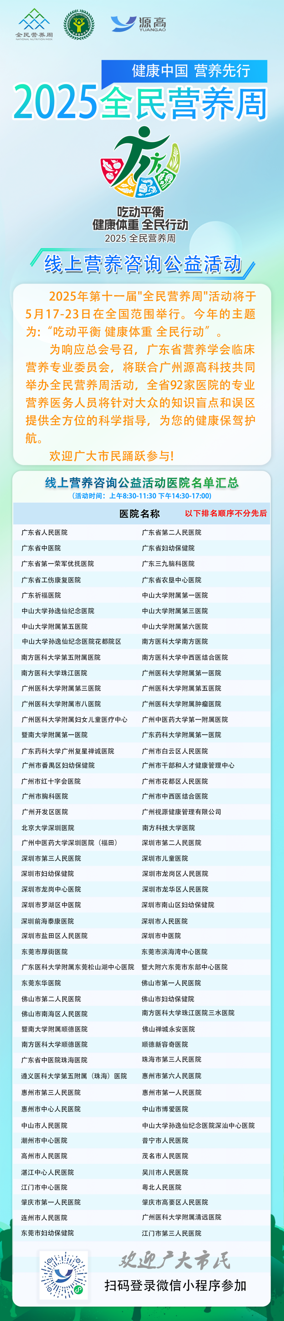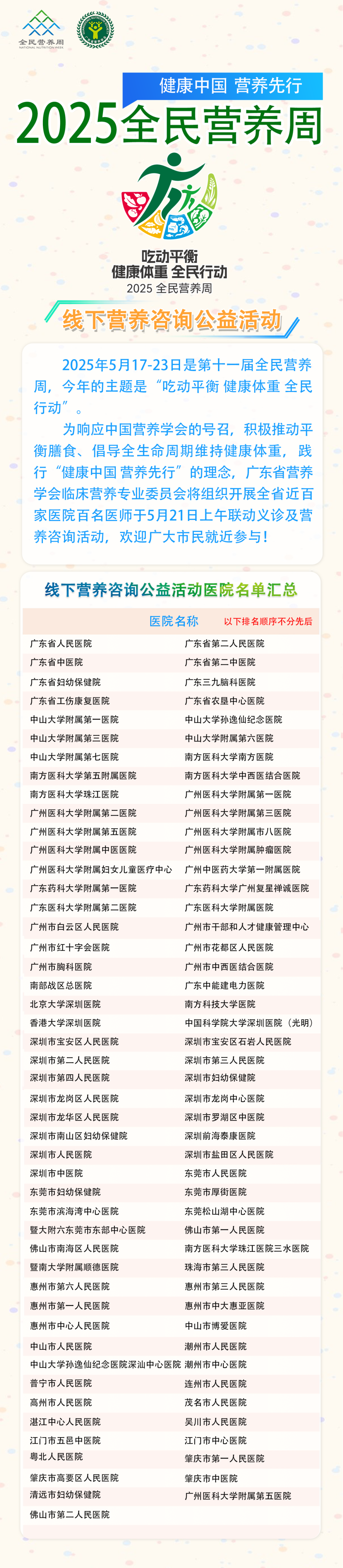 2025年5月17-23日,第十一届“全民营养周”将携“吃动平衡 健康体重 全民行动”主题席卷全国。值此健康盛会之际,广东省营养学会临床营养专业委员会特别策划大型惠民活动——全省百院百医营养健康联动工程。