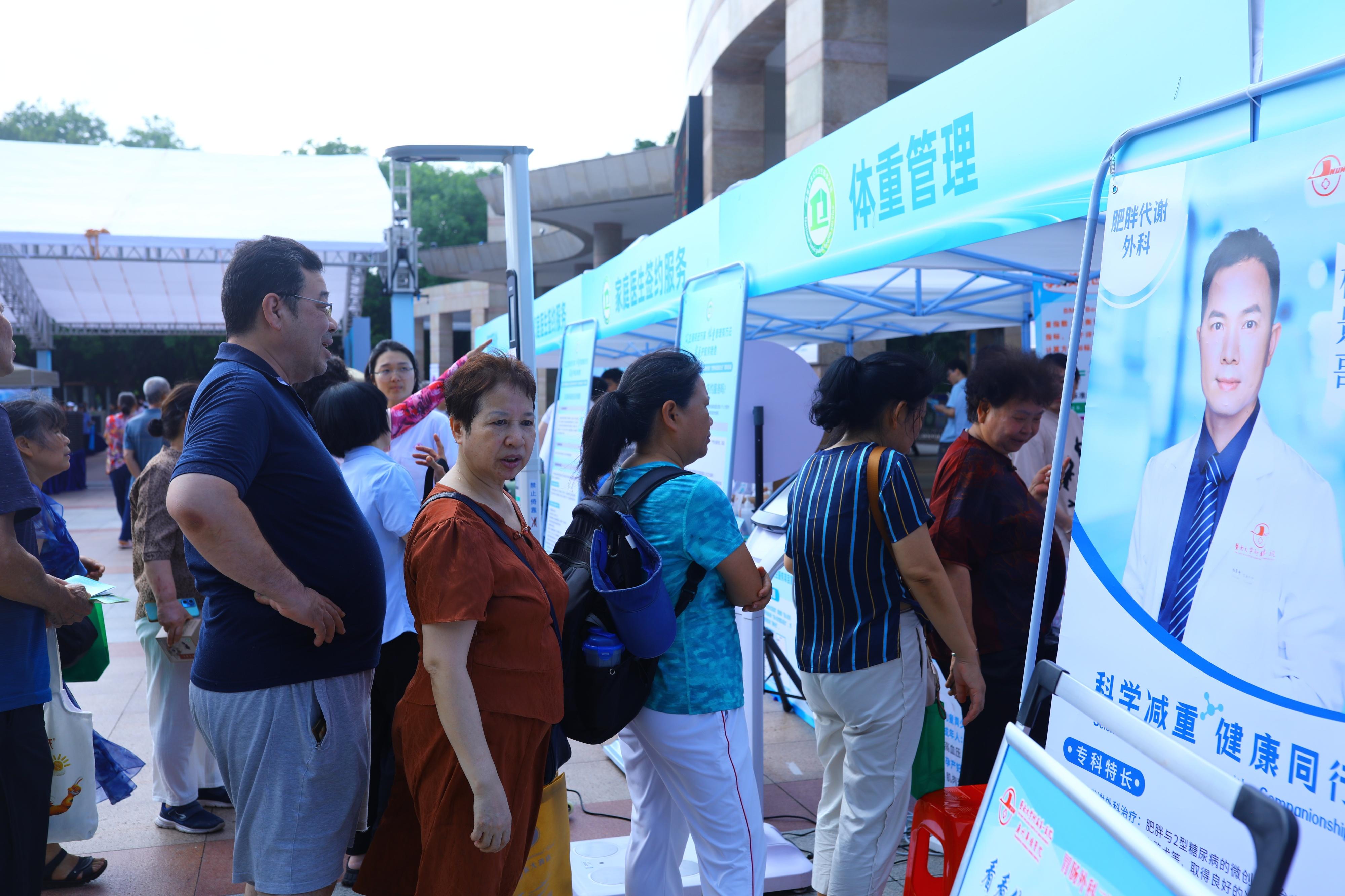 在体重管理摊位,前来参与的市民排起了大队,“主要关心体重问题。”一位操着东北口音的阿姨正在排队等待测量身体数据,随后会有专家进行针对性的解读;另一边,有阿姨受困于自己“怎么吃都不长肉”,想来听听专家的意见。