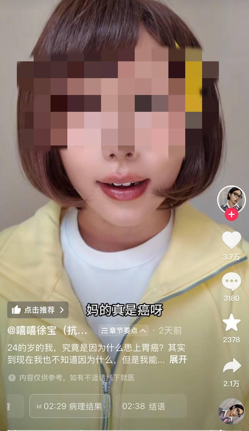 21日,24岁的视频博主“嘻嘻徐宝”发布视频讲述自己确诊胃癌的经历。她自述确诊前的症状表现有吃饭容易噎着、会不停地打嗝,肚子很鼓,感觉有很多气体,很容易饱,饭量也变小等。