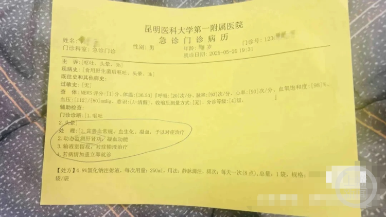 在出现中毒症状后,当天下午5点左右,余女士夫妻两人准备前往云大医院,“但发现连开车的力气都没有,只好搀扶着走到大门口打车。在医院排队见到医生后,医生告诉我们,赶紧叫家属来医院,说一会可能连去办理各项缴费的力气都没有,随时都会晕倒。”当晚在医院输完液,已经是次日凌晨0:30左右,余女士夫妻在家人的陪伴下返回家中休息。5月24日,余女士告诉记者,目前她身体已经好转,没有什么症状了,只是胃口还在恢复中。