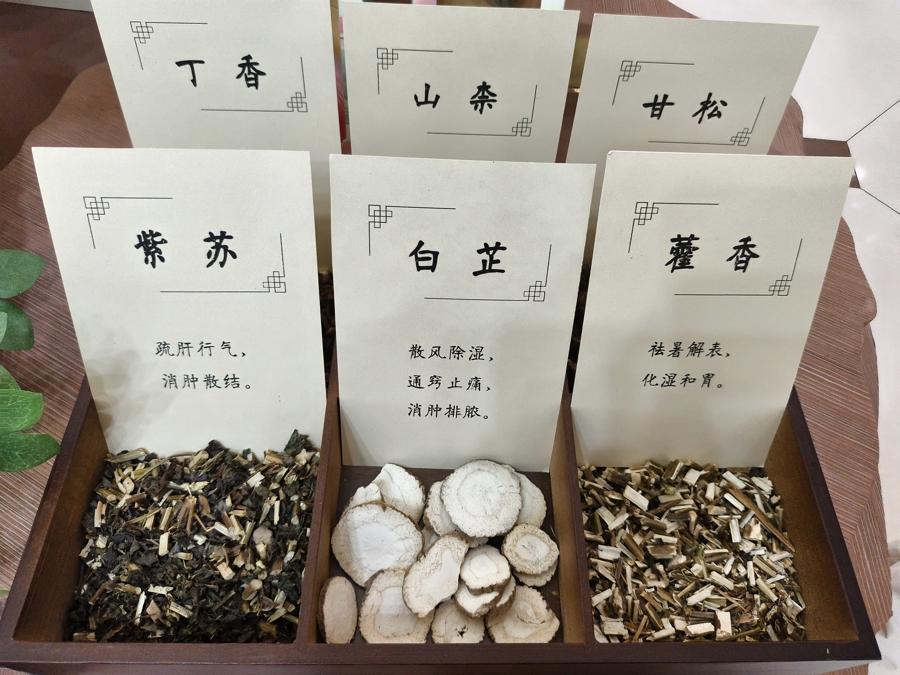 例如,常见的香囊填充物包括艾叶、丁香、山柰、甘松、紫苏、白芷、藿香、佩兰、薄荷、冰片、菖蒲等。每一味都很适合初夏:艾叶具有温经散寒、驱蚊避虫的功效;丁香具有温中降逆、补肾助阳的作用;紫苏利于疏肝行气、消肿散结;藿香能祛暑解表、化湿和胃;冰片,菖蒲,薄荷具有清热解暑、提神醒脑等作用。