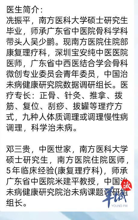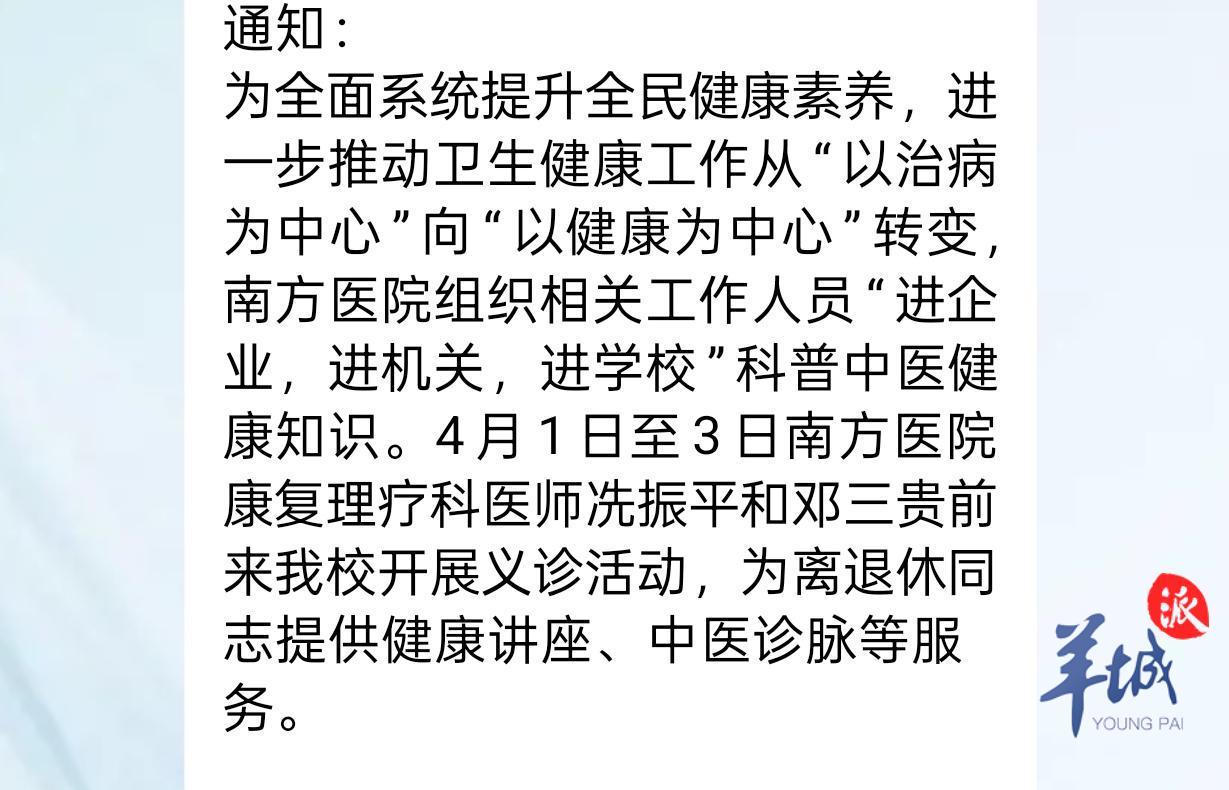据李先生介绍,自己的父亲是某校的退休教授,三月底,父亲在学校退休人员微信群中看到群通知:“4月1日至3日南方医院康复理疗科医师冼振平和邓三贵前来我校开展义诊活动,为离退休同志提供健康讲座、中医诊脉等服务。”由于通知是学校发布,李先生并未怀疑。