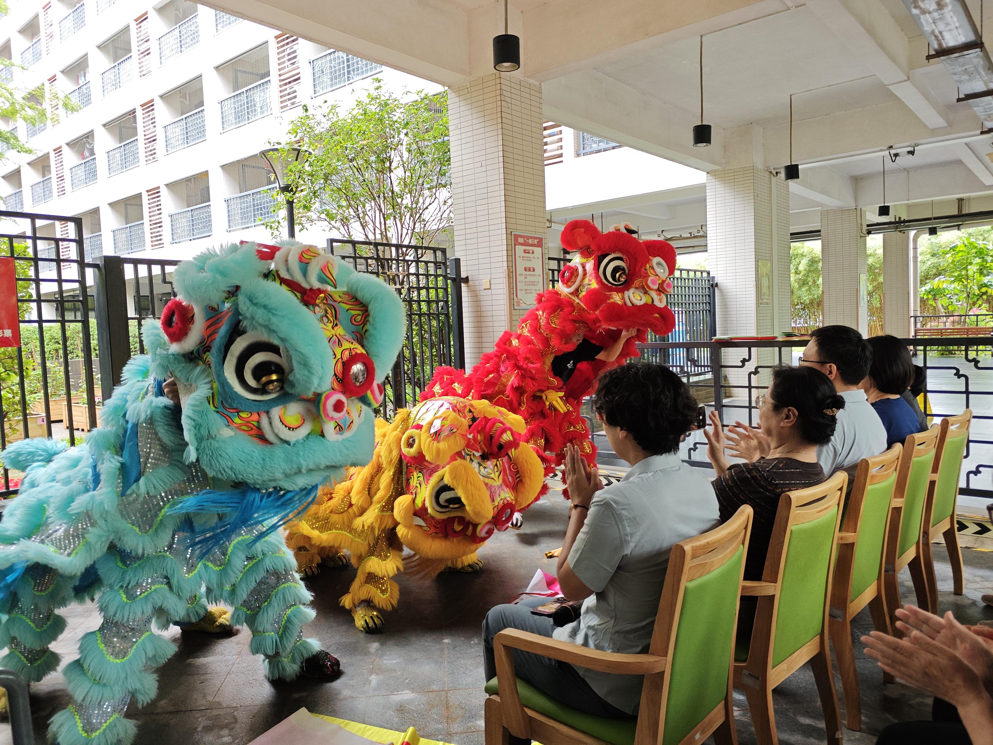 五彩醒狮腾跃入场,为游园会拉开欢乐序幕。金狮摇头摆尾、眨眼逗趣,引得全场人员纷纷拍手叫好。“好多年没摸过狮头啦!”85岁的李伯在队员指导下轻抚狮头,笑得合不拢嘴。舞狮队员们蹲下身来,坐轮椅的长者也能亲手为醒狮扶额,寓意吉祥安康。更有活泼的醒狮突然“变”出粽子香囊,逗得长者们欢笑连连。