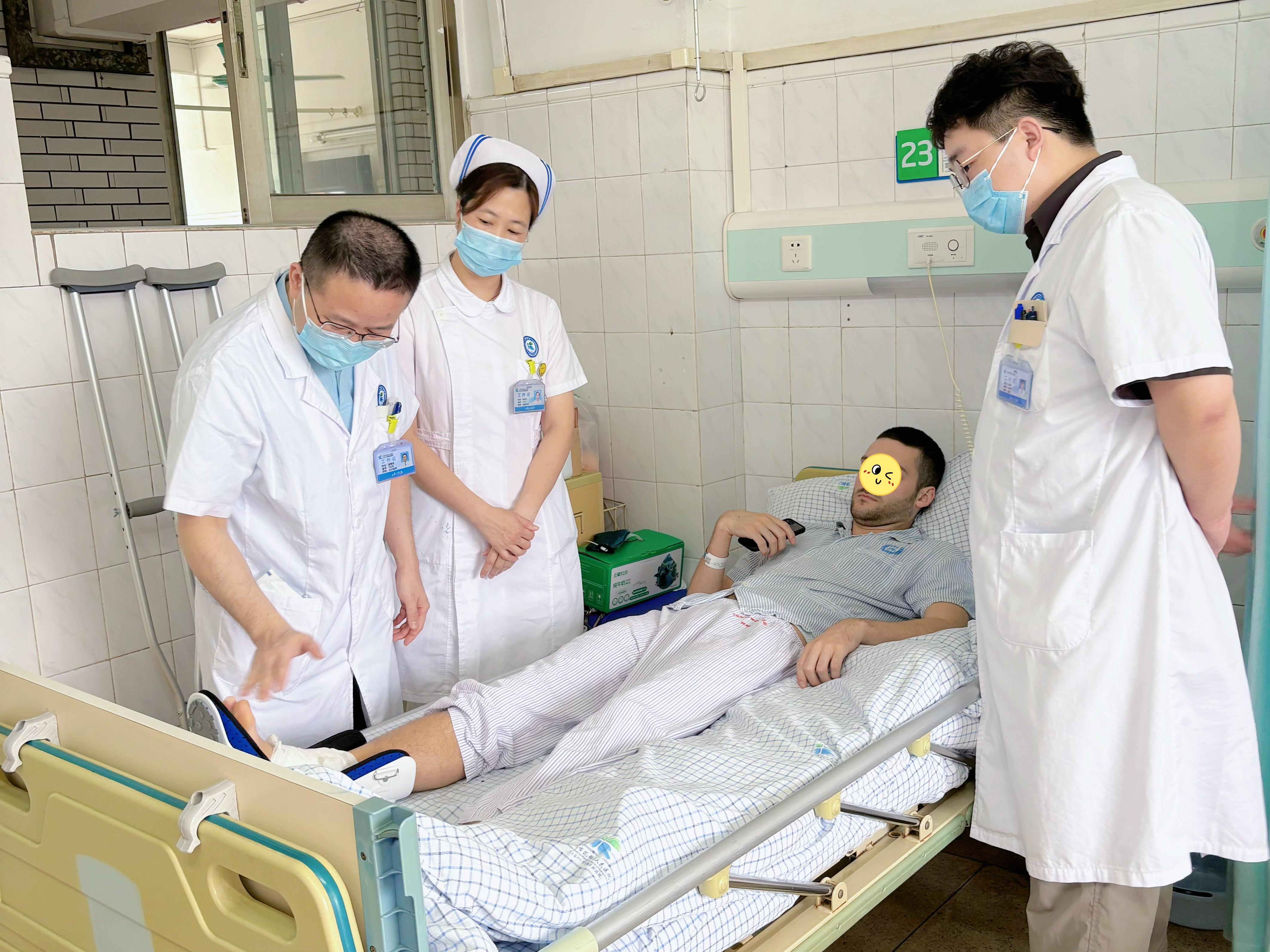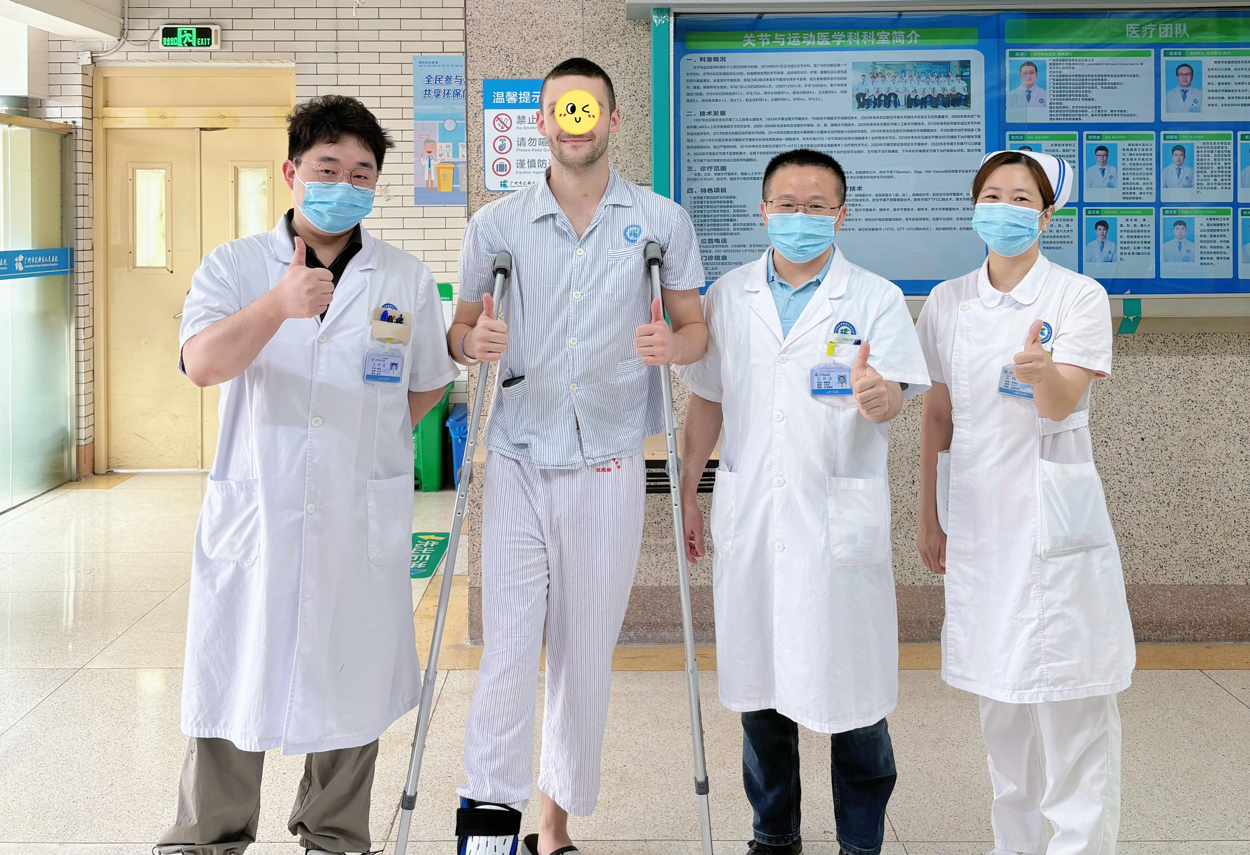 术后第一天,山姆惊喜地发现,右踝不仅没有明显不适,关节被动屈伸也十分顺畅;第二天,在康复医生的专业指导下,他已能佩戴支具、拄拐尝试下地锻炼;第三天,经检查伤口愈合良好,完成换药处理后便顺利出院。