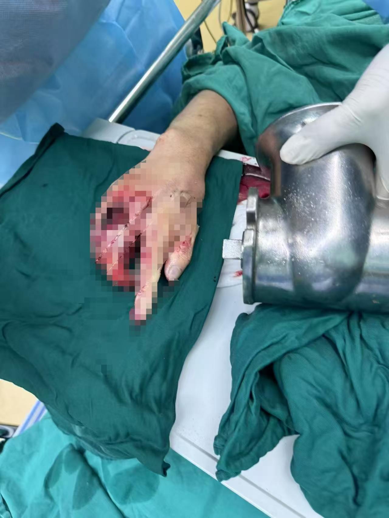 据了解,当晚,阿彬的右手不慎被卷入正在作业的绞肉机内,强大的力量瞬间将他的手部与机器“锁”在了一起。剧烈的疼痛和创伤导致他随时可能发生休克。120救护车火速将阿彬送至珠江医院急诊科。