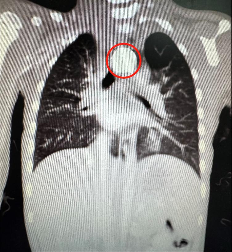 4岁的小雨(化名)出于好奇,将一枚纽扣电池吞进了肚子,家人却浑然不知。三天后,孩子突然剧烈呕吐、高烧不退,送当地医院检查才惊觉真相:纽扣电池死死卡在食管胸上段,紧邻气管与大动脉(主动脉)!此时,电池强腐蚀性电解液已开始“啃噬”周围组织,形成溃疡。