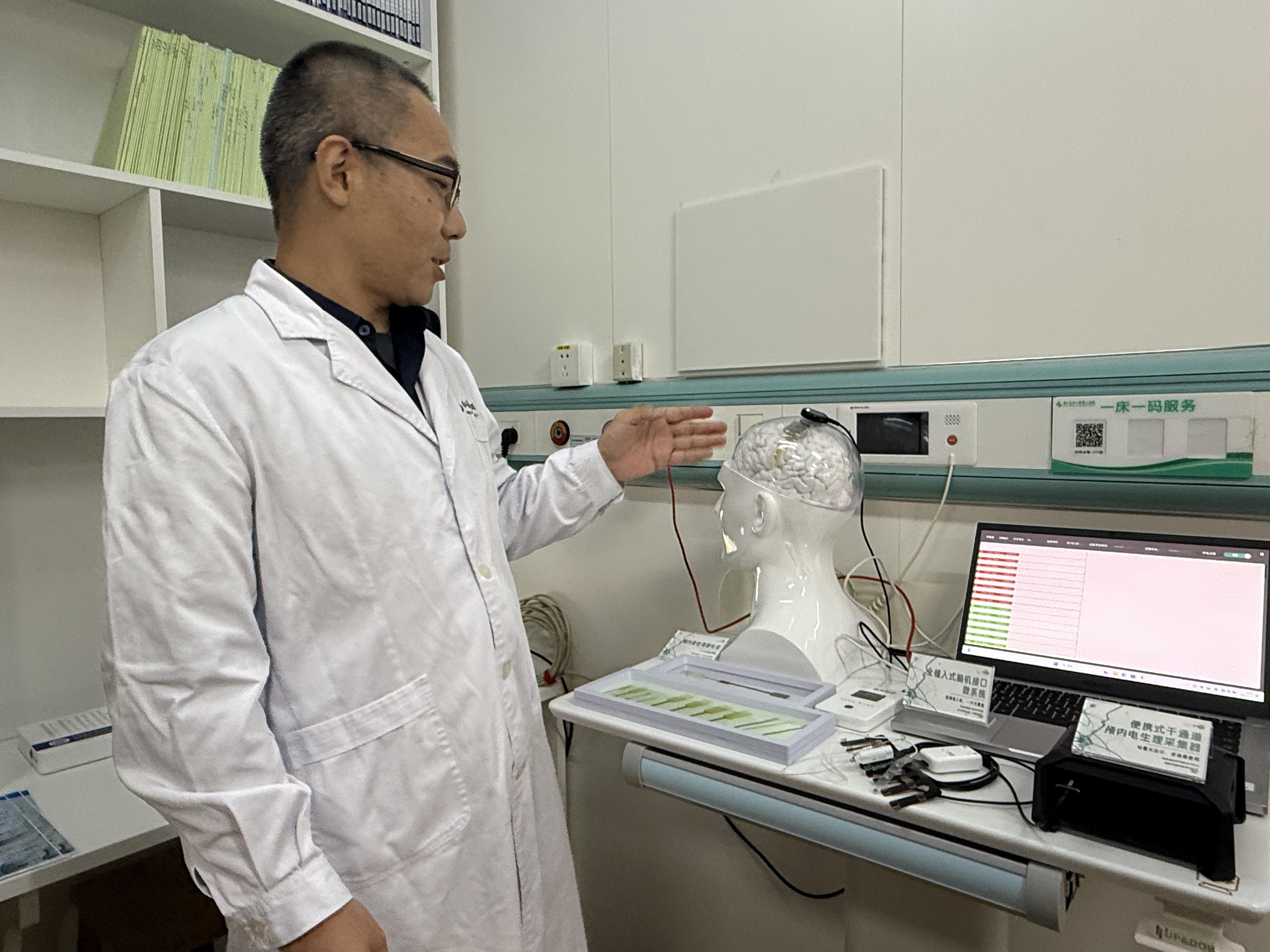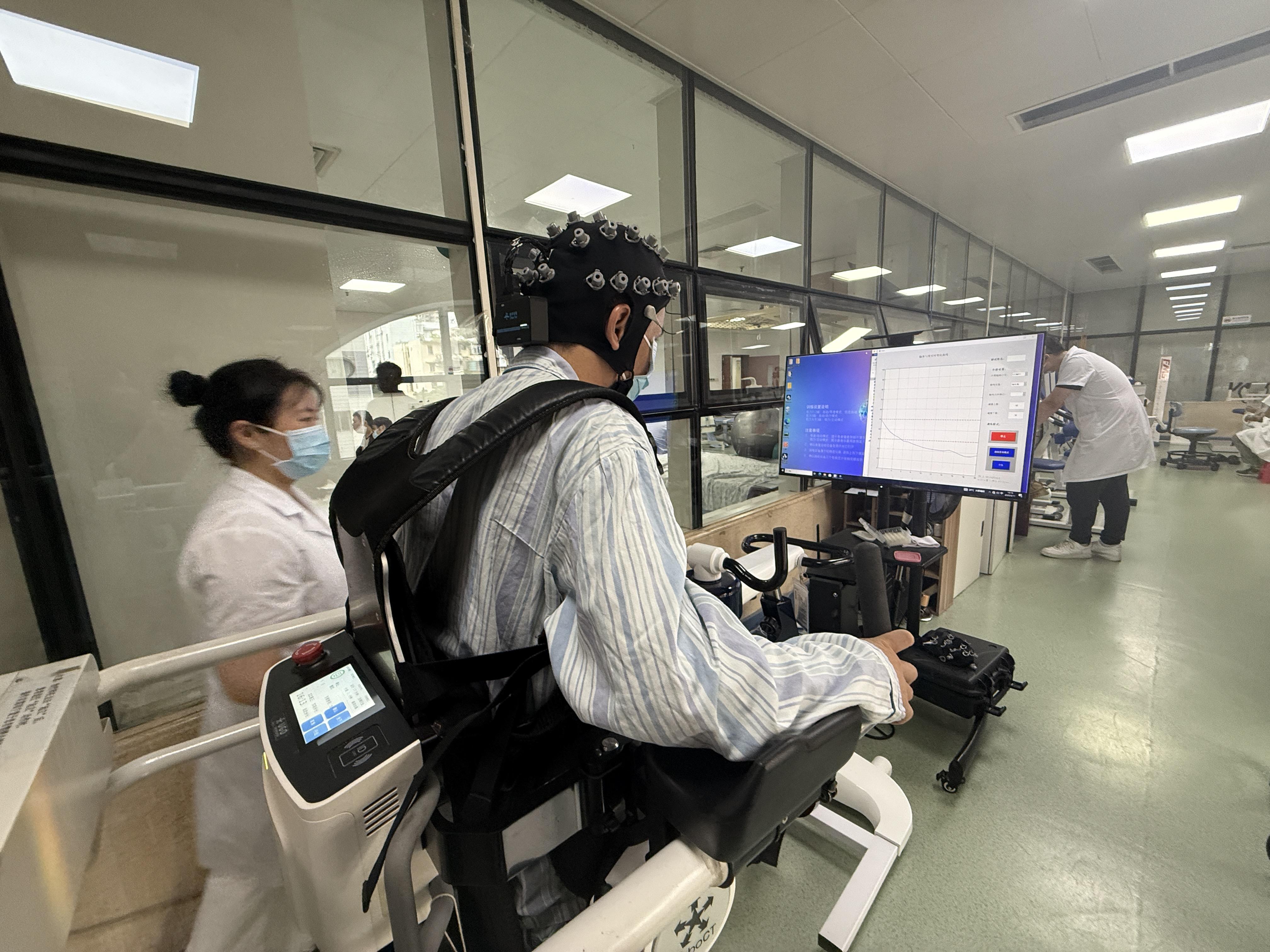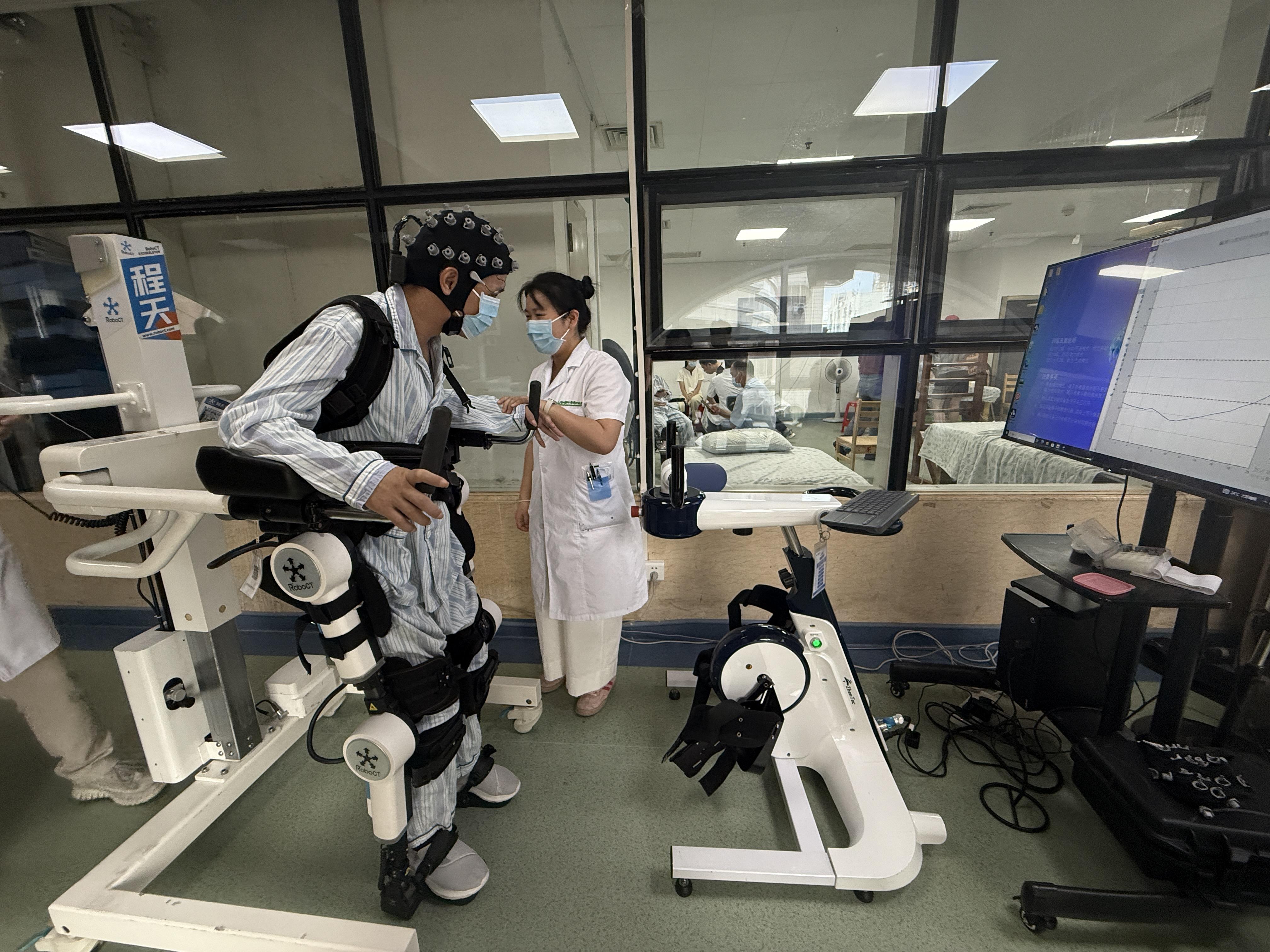 头顶布满电极的金属帽,41岁的脊髓损伤患者陈明(化名)盯着前方屏幕,集中意念抬腿。当脑电波信号被实时解码,机械外骨骼启动,支撑他迈开脚步。“患者通过非侵入式脑机接口,实现大脑与外部设备的双向交互。脑电波信号被解码后,驱动外部设备,带动肢体活动或触发肌肉收缩,从而促进下肢功能的恢复。”南方医科大学珠江医院康复医学科主任吴文向记者解释。