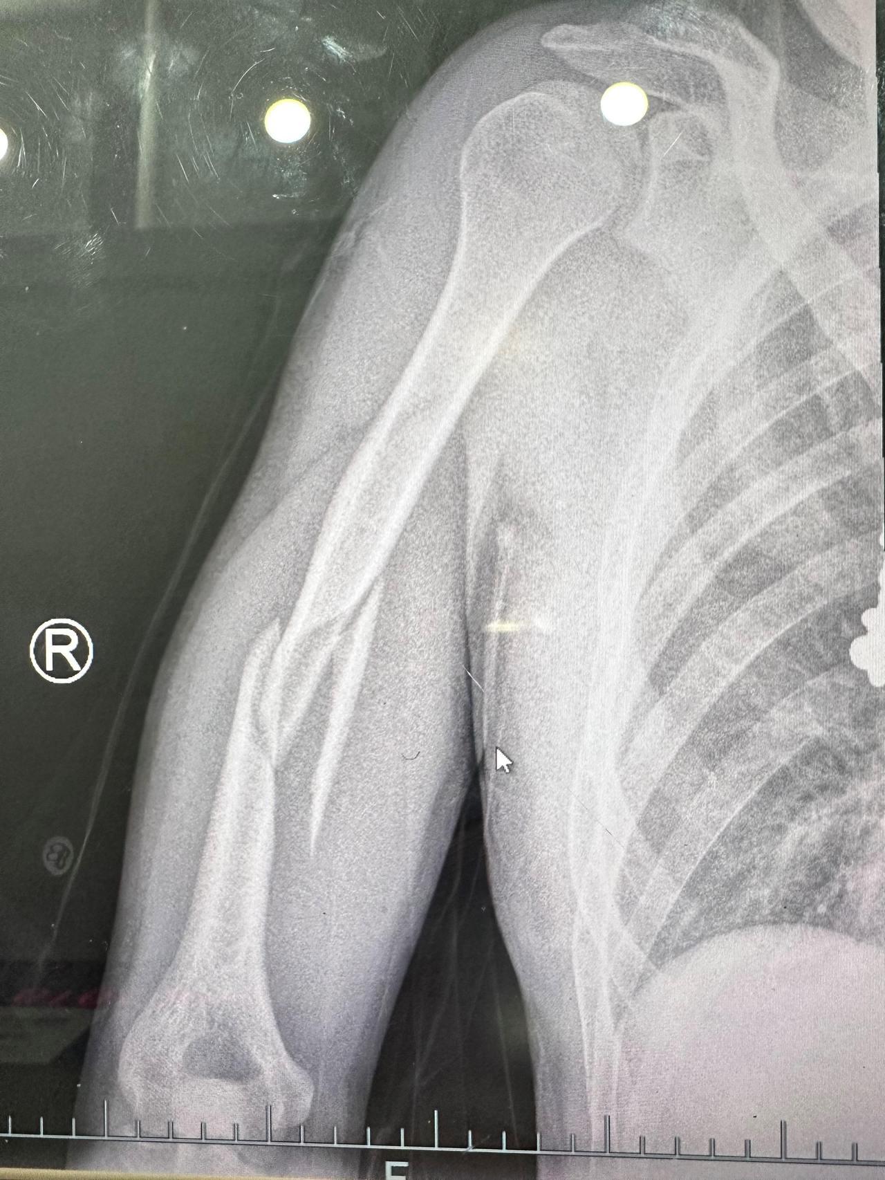 无独有偶,仅仅一周后的夜晚,一名33岁的年轻男子栾先生(化名),也因为掰手腕导致上臂疼痛难忍,被紧急送到急诊科。急诊科医生肖晨在经过详细检查后,发现他的右上臂骨头竟然断成了三截!
