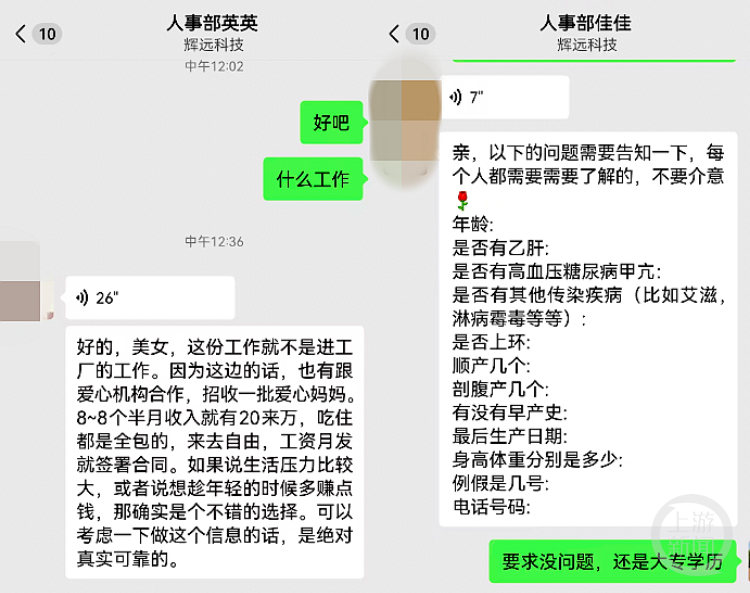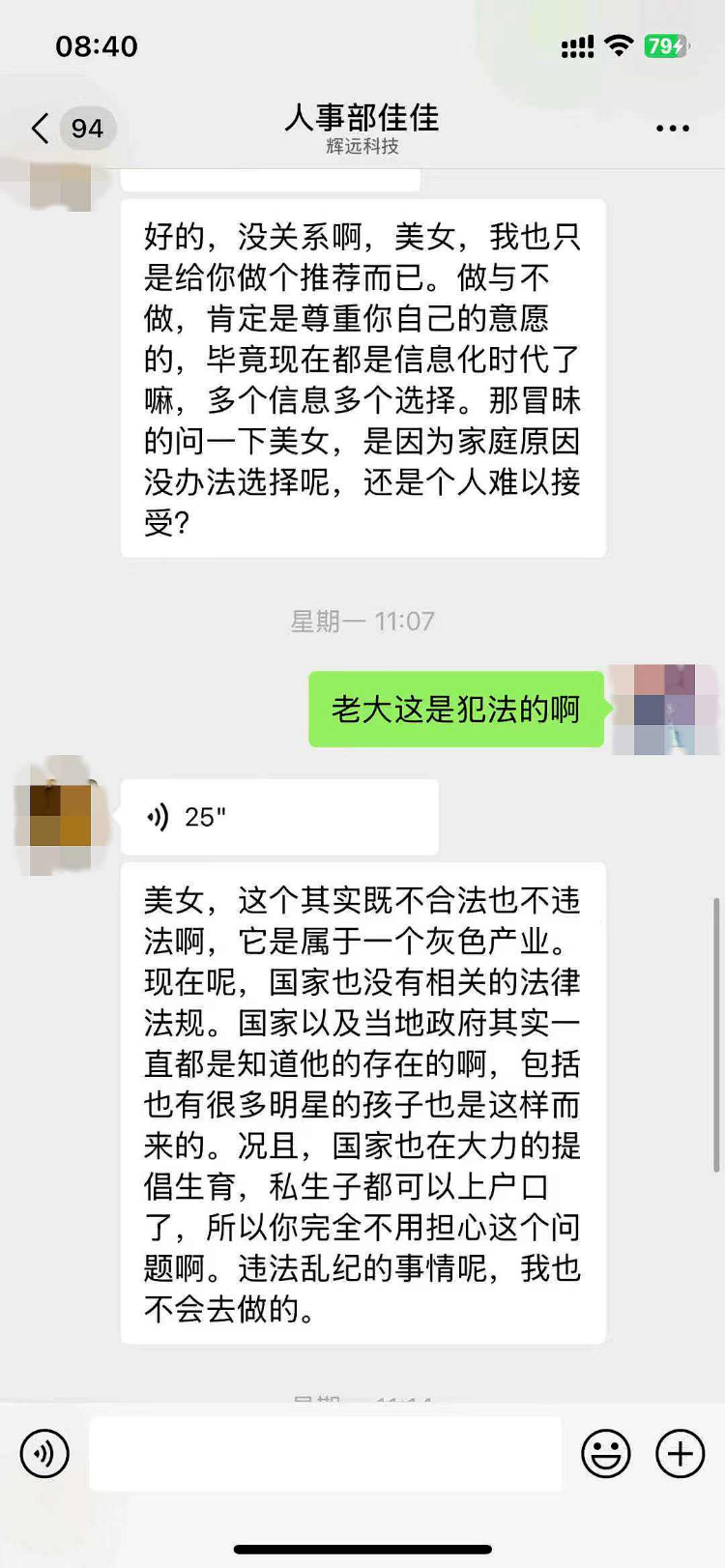 6月9日,阳光在某社交平台上,看到网名为“地狱之火”的网友发招聘信息,信息显示“四川绵阳电商仓库招聘服装打包,24元一个小时,包吃包住,单休,交五险一金,坐班,白班,早九晚五”。随后,阳光私信了“地狱之火”,在询问了阳光的年龄后,根据对方的安排,阳光添加了“辉远科技”企业号微信,微信名为“人事部佳佳”。但让她没想到的是,这个“人事部佳佳”居然推荐她做代孕。