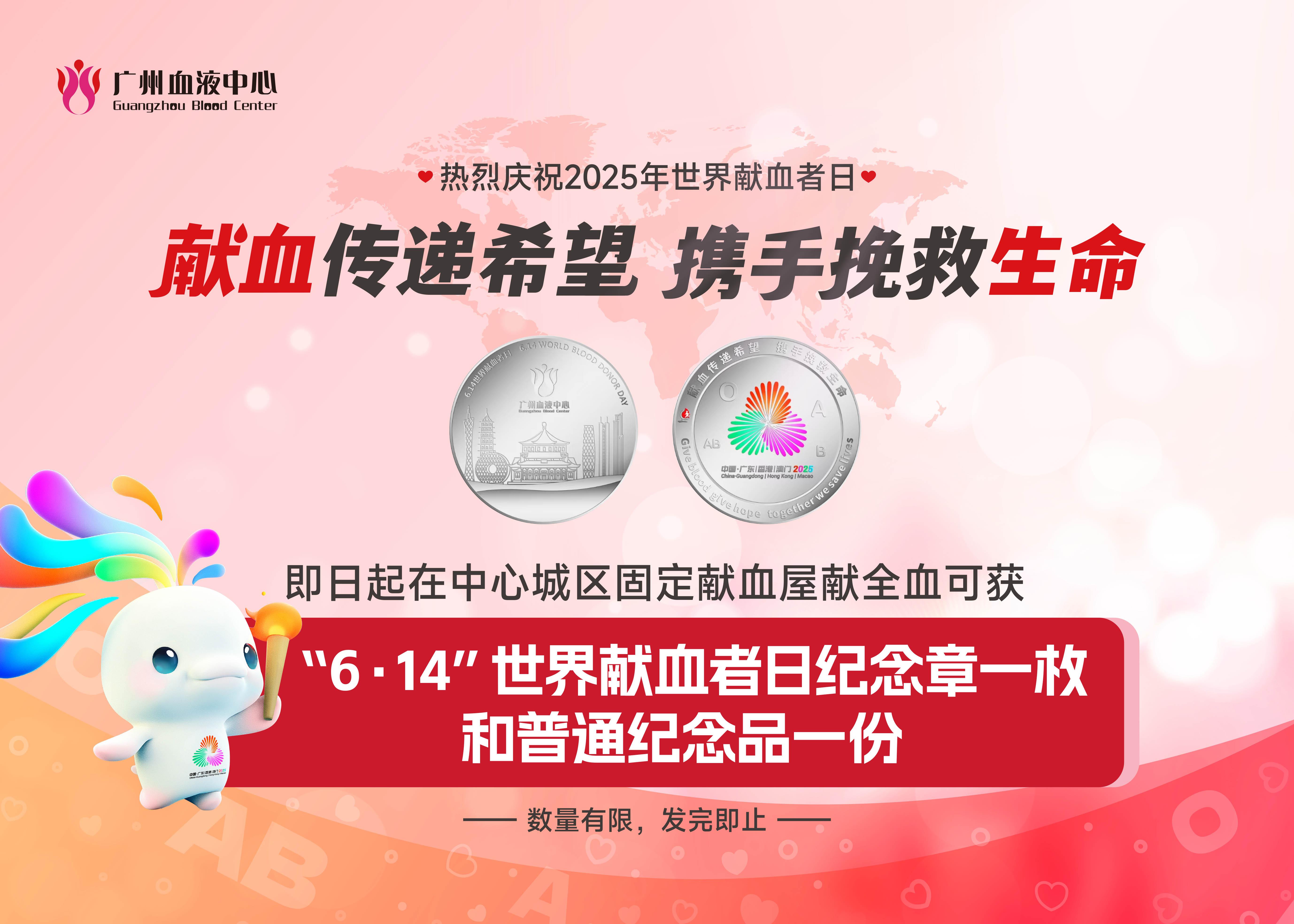 6月14日是世界献血者日,今年的主题是“献血传递希望,携手挽救生命”。记者了解到,今年广州血液中心特别推出的“6·14”献血纪念章融合了第十五届全运会的元素,即日起到6月30日,市民在广州中心城区献血点成功献血,即可获得献血纪念章1枚。