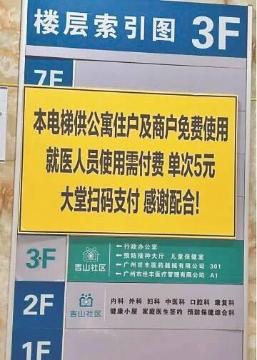 “就医人员使用电梯需付费,单次5元。”近日,广州市天河区珠吉街吉山社区卫生服务站这样一则告示引发热议。舆论发酵之下,服务站及天河区卫生健康局相继作出回应。概而言之,确有其事,不过收费要求是由该站所在的顺谊公寓制定,收取的资金不归站方所有;该站是非政府设立的基层医疗卫生机构,属非营利性医疗机构,租用公寓作为办公用房。