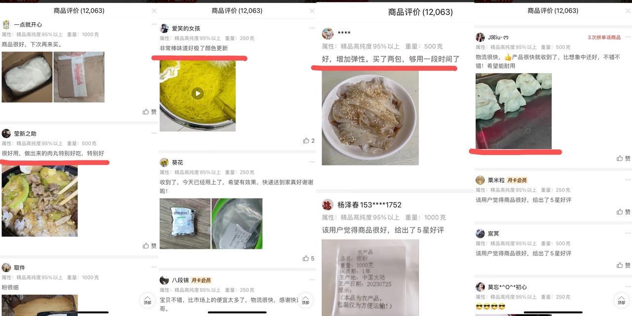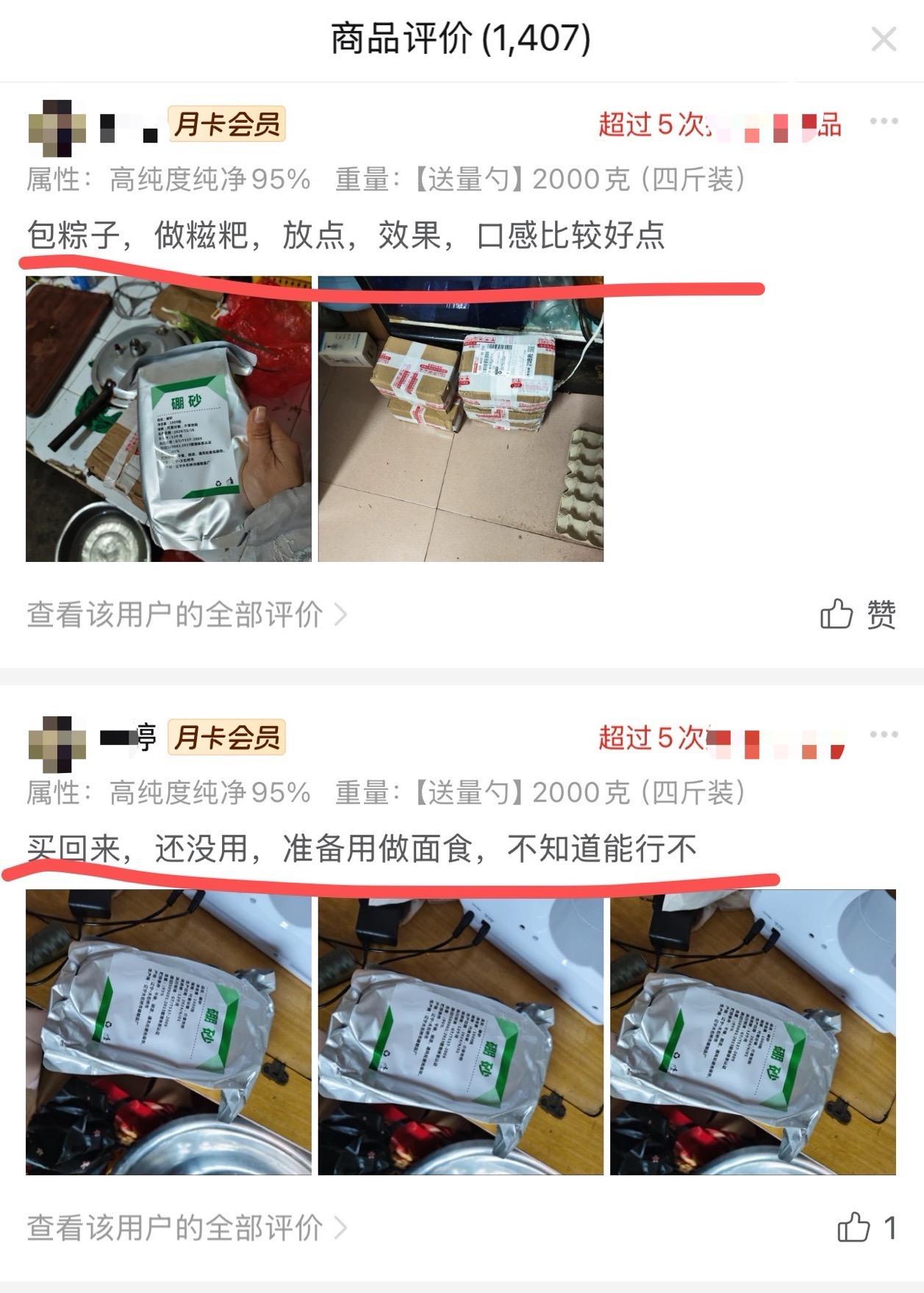 一位5次复购的消费者在评价中称“添加到面食”“包粽子,做糍粑,放点,口感比较好”“自己配的冰硼散,嗓子都不疼了”……也有人晒图称,将硼砂糅进面团中,制作出的面条更有韧性;还有人称,“(硼砂)做出来的肉丸,特别好”。