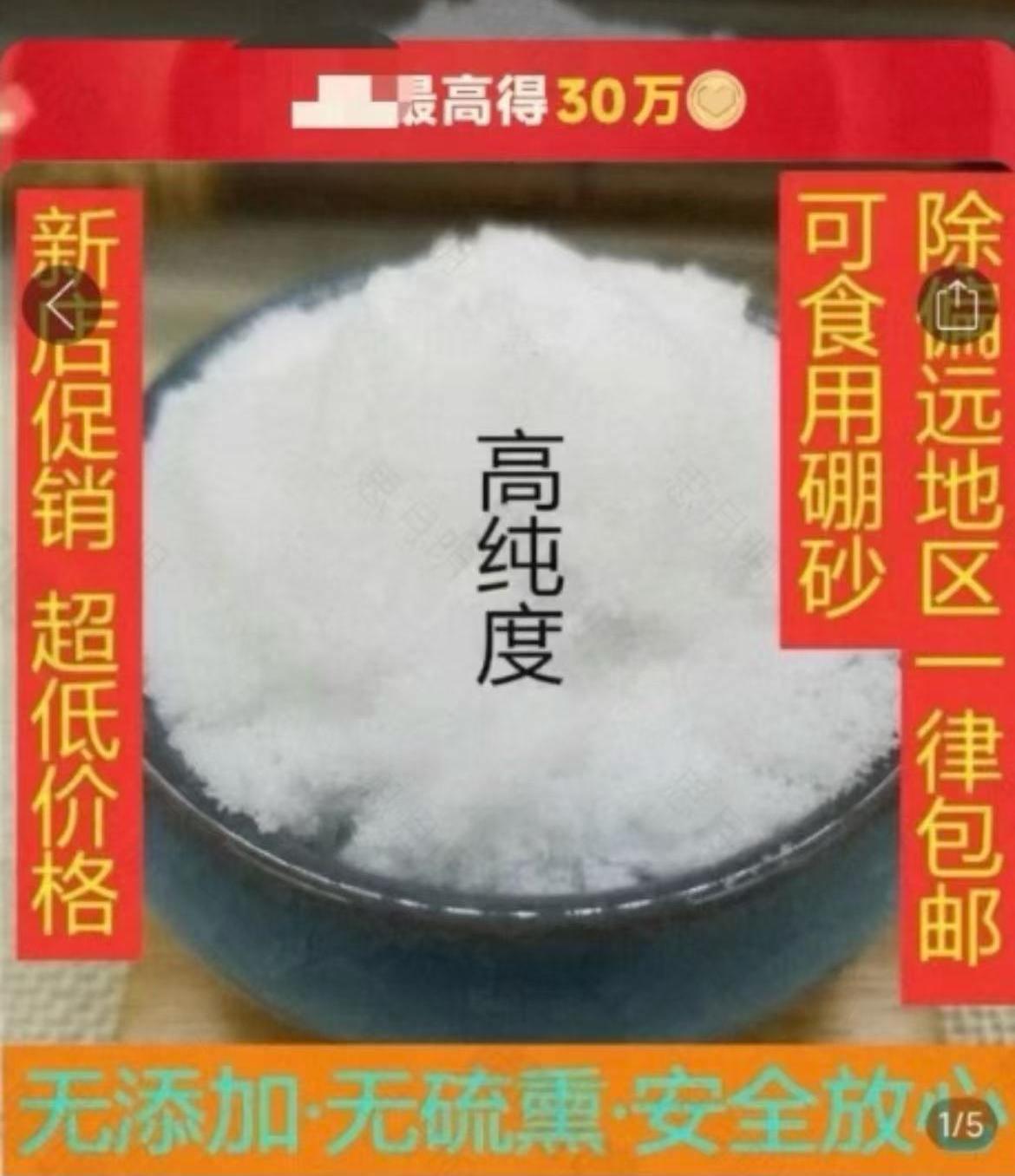 记者调查发现,在多个电商平台上,高纯度(99.9%、95%)硼砂销售极为普遍,部分商家将硼砂分装出售,将其称为初级农产品。还有的商家宣称其销售的是“可食用硼砂”“可以增加Q弹口感”,引导消费者购买。