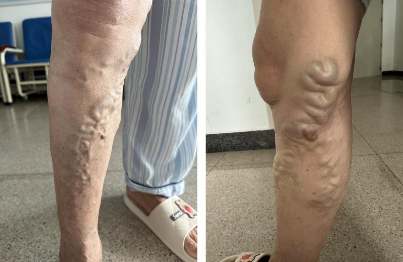 59岁的杨女士来自茂名市,多年来一直被下肢静脉曲张所困扰。她的小腿上布满了像“蚯蚓”一样的曲张静脉,不仅影响美观,还时常感到腿部沉重、酸胀,尤其在天气炎热或长时间站立后,症状更加明显。杨女士坦言:“以前走几步路就觉得小腿像灌了铅一样,天气热了都不敢穿裙子,真是苦不堪言。”