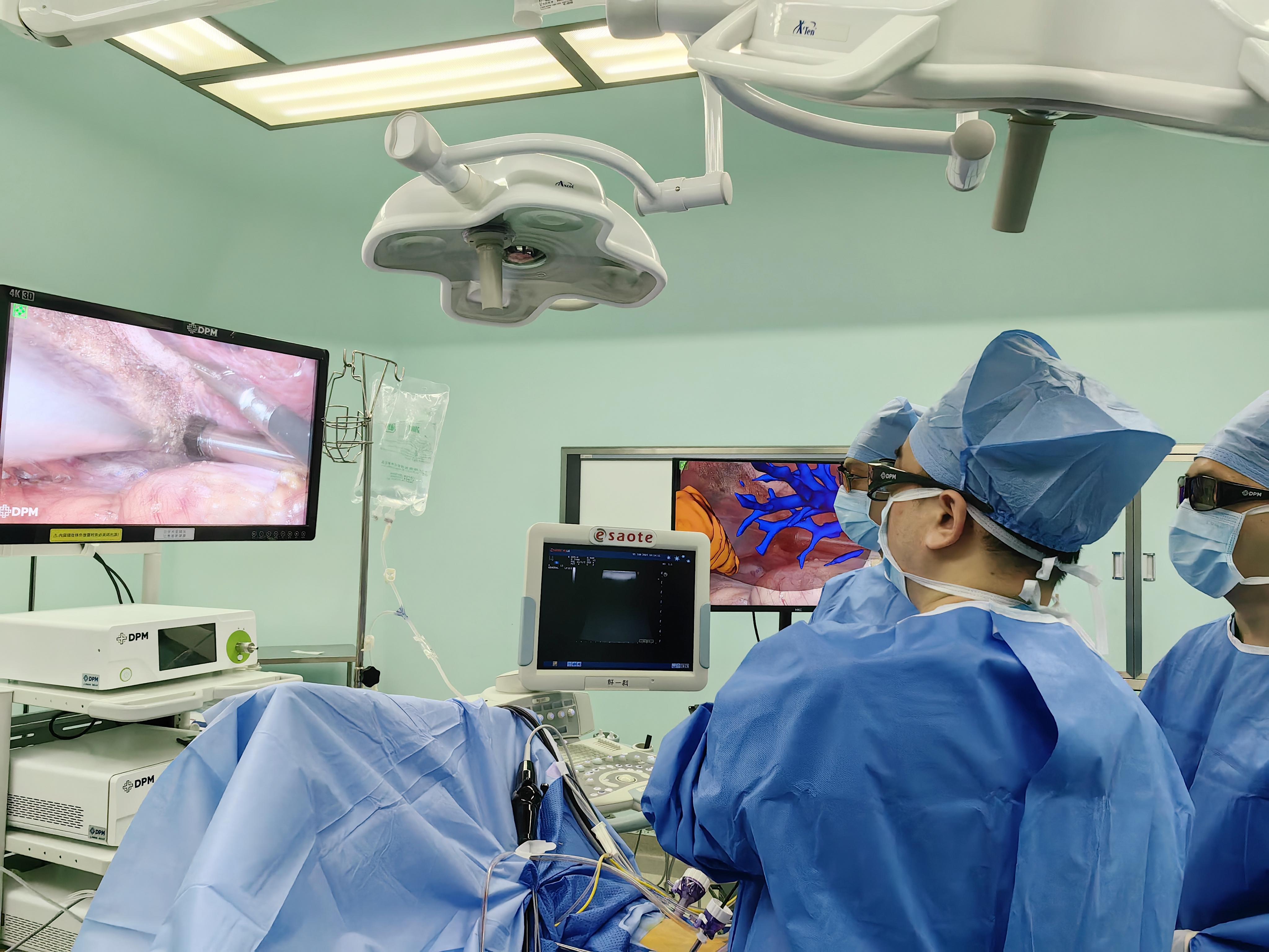 手术过程中,项楠主任医师仅在患者腹部打几个小孔,采用增强现实导航技术,将血管影像叠加在腹腔镜画面上,实时 “透视” 血管,及时避开危险区域。“这就像给肝脏安装上了‘GPS导航’。” 项楠主任医师说。
