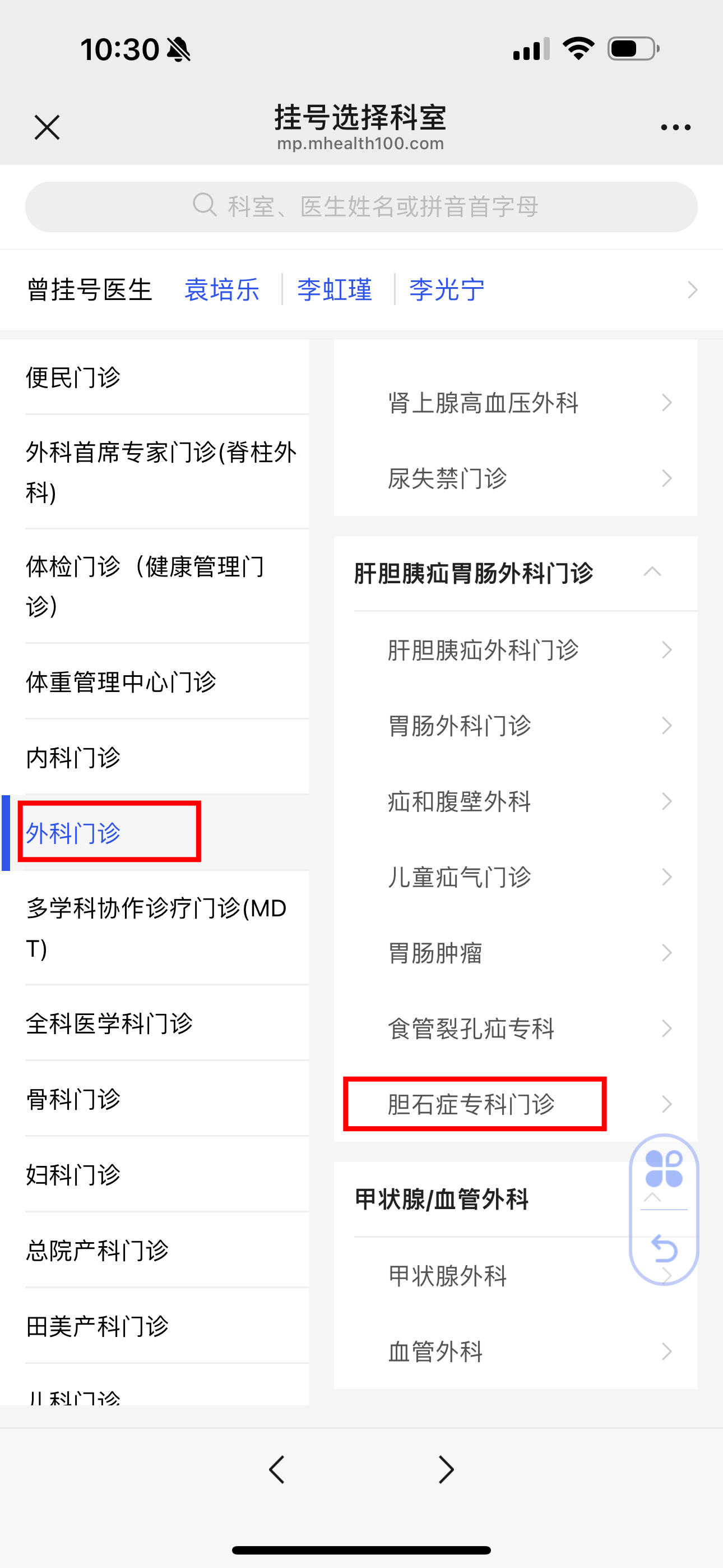 ③ 点击外科门诊:找到【外科门诊】,点击【胆石症专科门诊】,选择就诊时间即可!