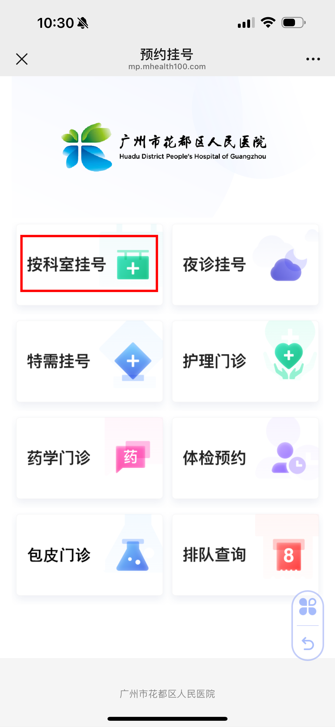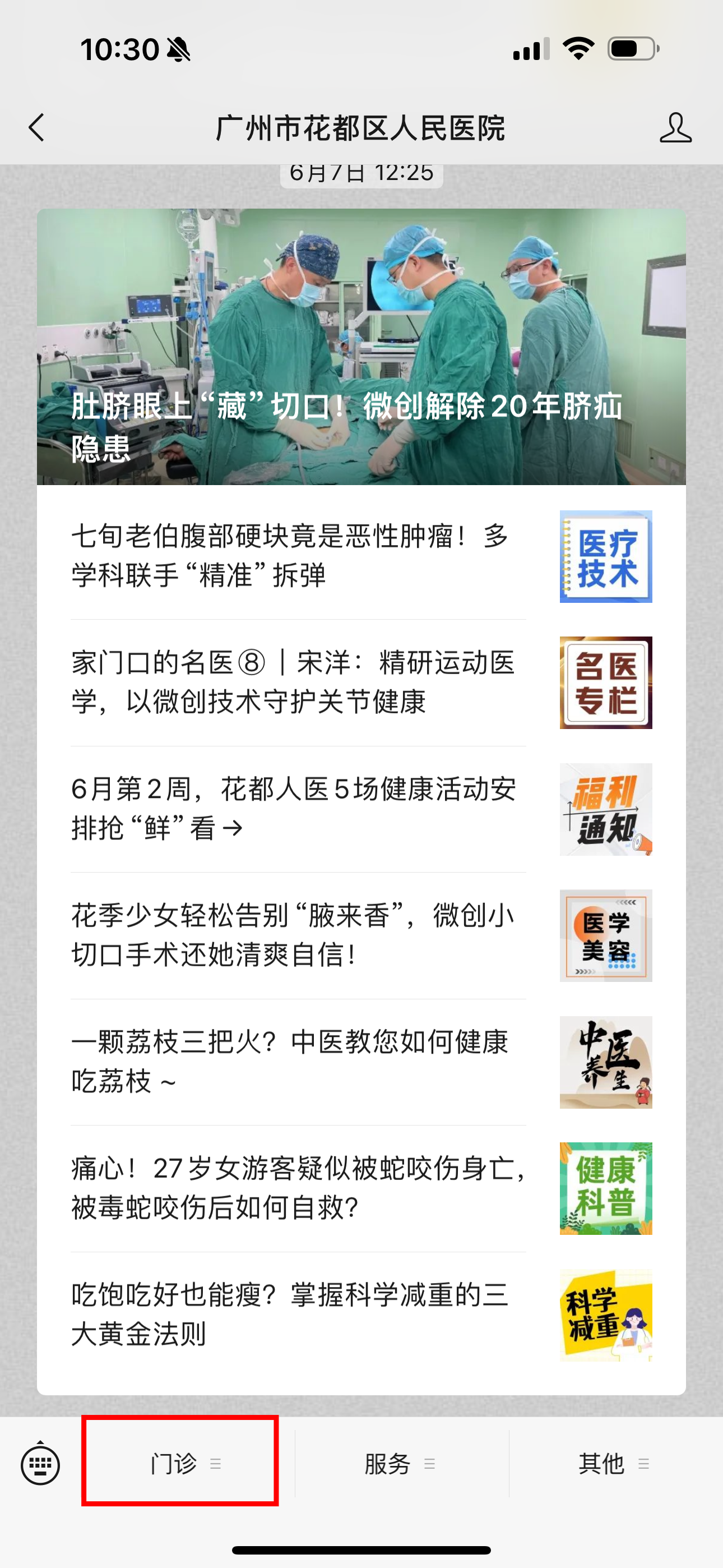 ① 关注公众号:微信搜索“广州市花都区人民医院”,点击底部【门诊】-【预约挂号】;