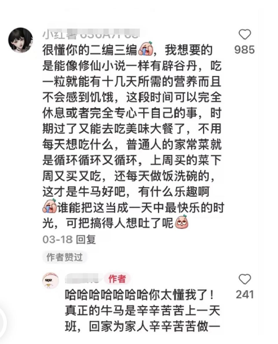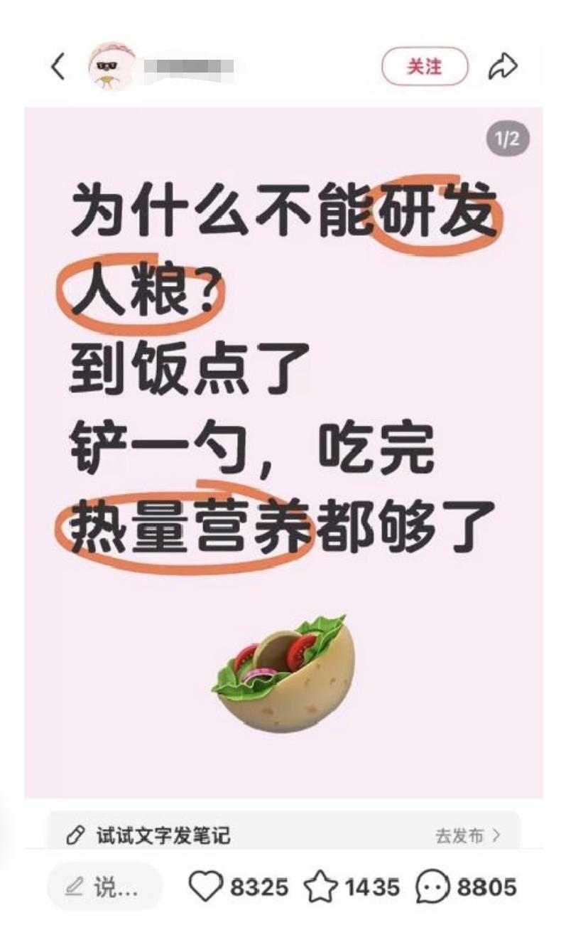 从市场逻辑来看,需求催生供给,网上不少网友对这类代餐产品公开表达支持,认为其契合快节奏的生活需求。除了阿泽这样的出差党,许多回家吃饭的打工人也力挺 “人粮”。Momo在小红书上留言:“真正的牛马是辛辛苦苦上一天班,回家还要辛辛苦苦为家人做饭。”