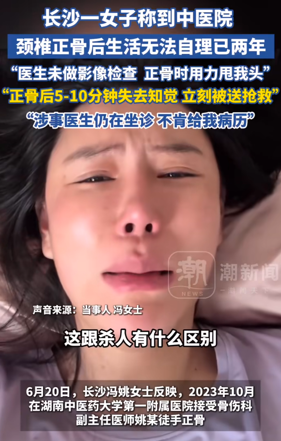 “我基本不能像一个正常人那样生活。”6月17日,记者联系到长沙市民冯姚。她表示,2023年在湖南中医药大学第一附属医院(以下简称“湖南中医附一院”)颈部正骨导致颈椎损伤,事发近2年时间,她的身体状况不仅没有恢复得很好,也因无法获得就诊病历导致未能进一步维权等。