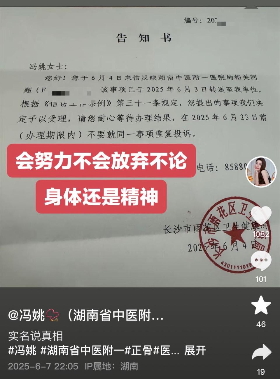 冯姚在其个人社交媒体账号发布的《告知书》显示,长沙市雨花区卫生健康局在2025年6月4日告知冯姚,其反映湖南中医附一医院的相关问题已于2025年6月3日转送至其单位,并表示决定予以受理。