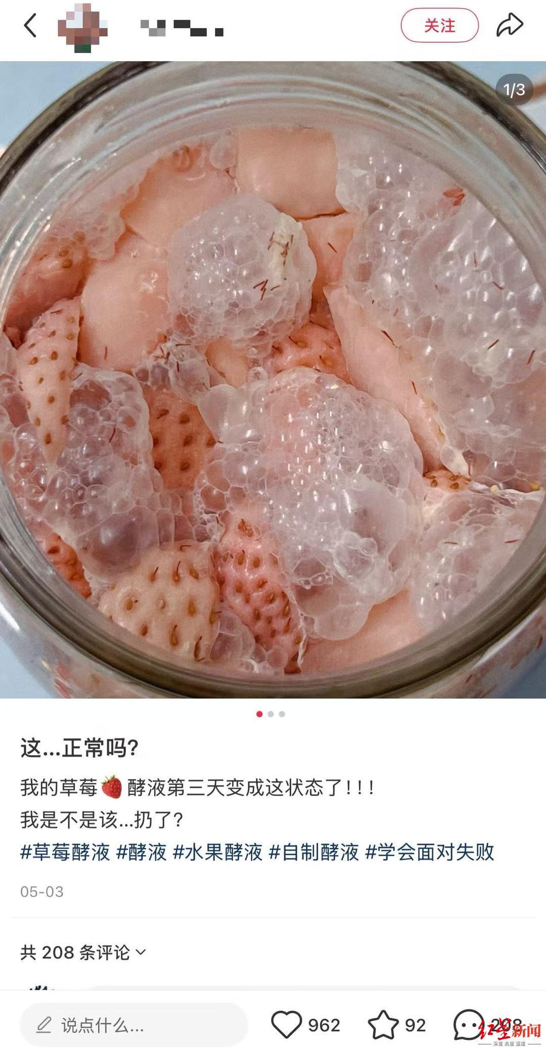 “一方面,不少人在原材料的选择上存在一定的问题,如水果等原材料本身不新鲜,或者泡制过程中未使用凉白开或纯净水,而使用了自来水,就会导致污染风险。”她提到,另一方面,发酵食品对水、糖/盐的混合比例要求较高,“如果选择不合适,就会抑制乳酸菌的产生,反而促生有害细菌,从而影响发酵效果。”